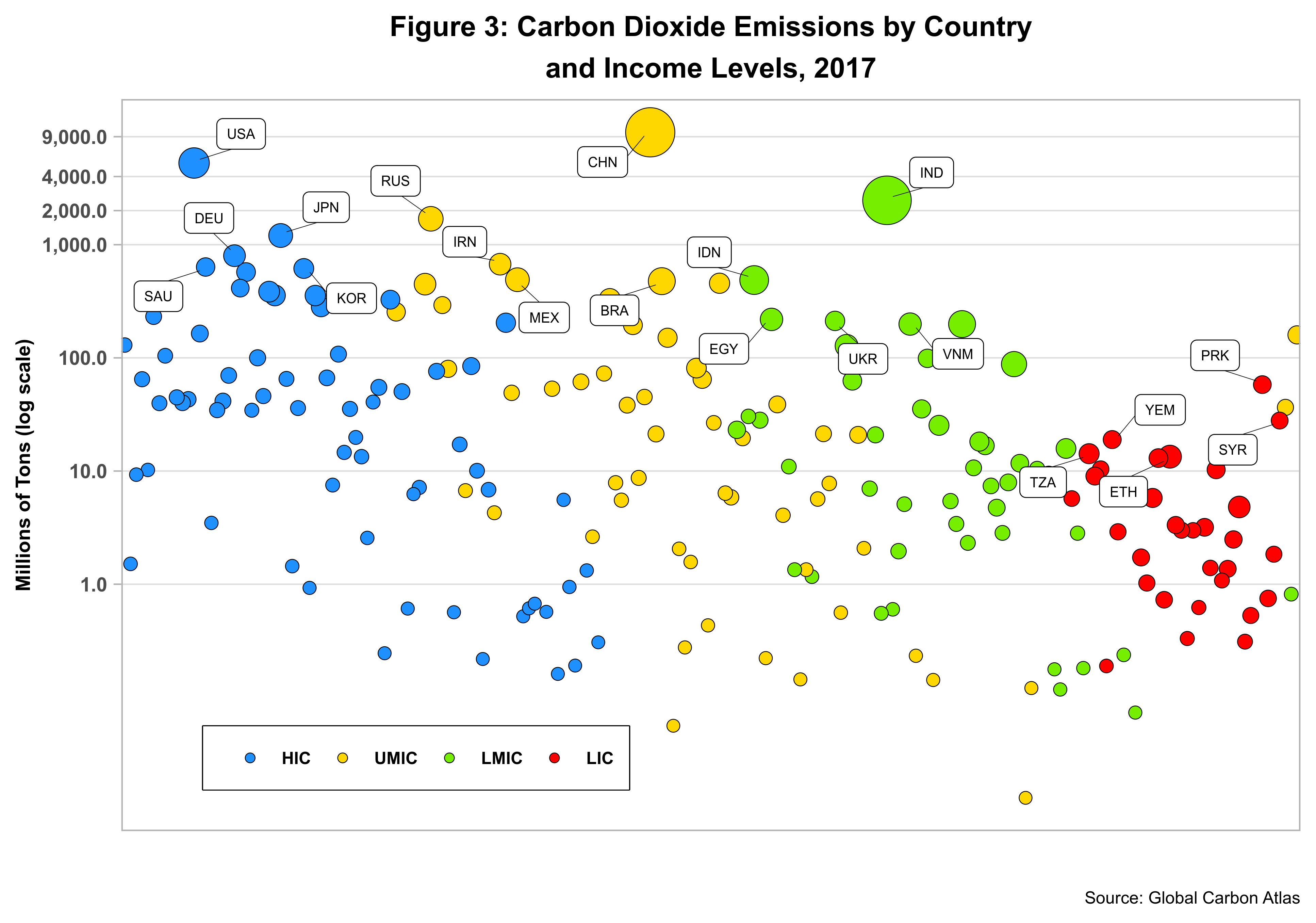 Using a log scale to magnify countries sitting at the bottom of the emissions pyramid, figure 3 depicts the top five countries for each of the income levels defined by the World Bank for 2017 – bubble size determined by the total in-country population.