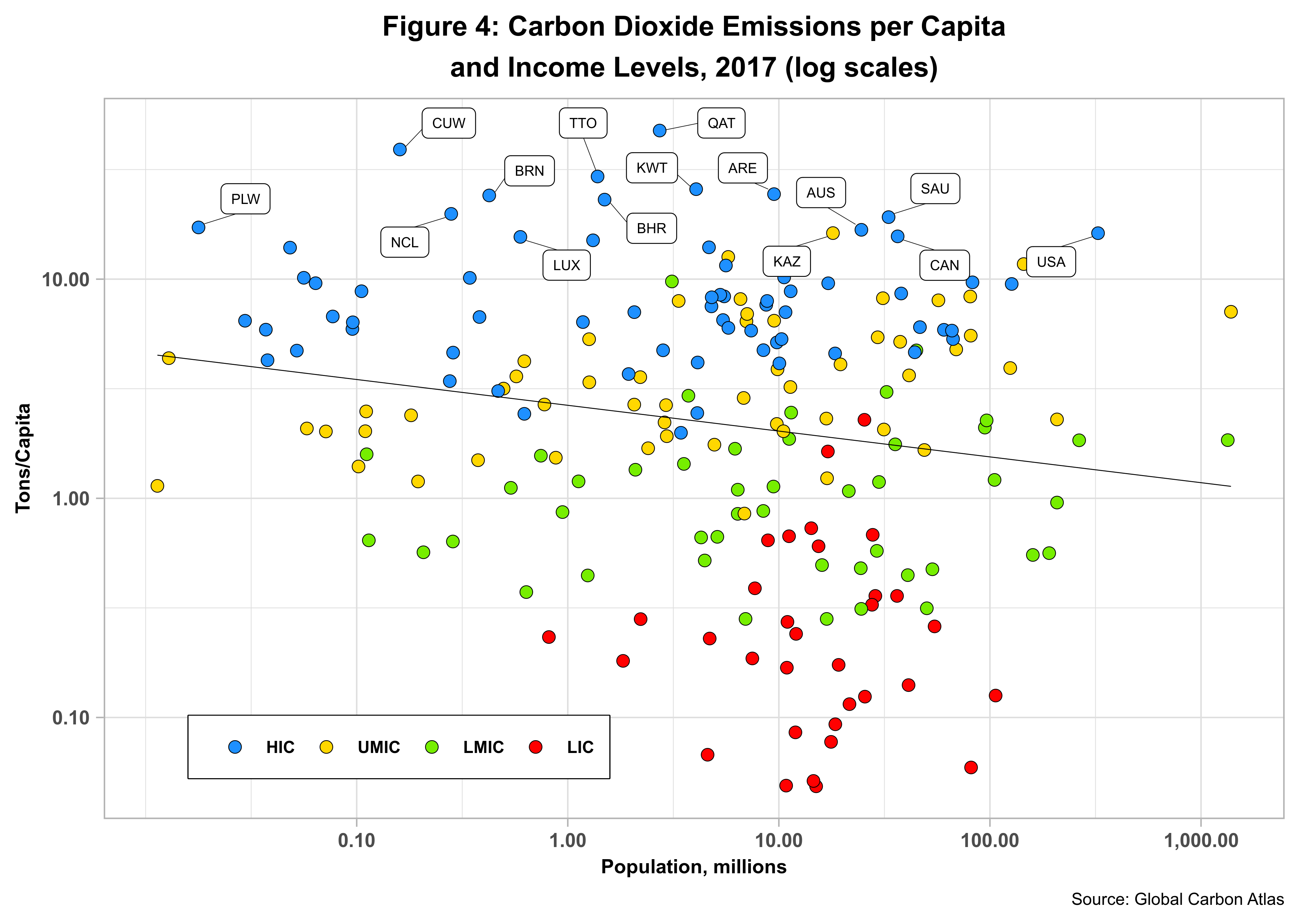 The top 15 countries are labeled with Qatar taking the top spot. Note that all countries with higher emissions per capita, excluding Kazakhstan, belong to the high-income category with most having relatively small populations, In fact, the U.S. is the only top 15 country with a population greater than 35 million. On the other hand, most LICS and many LMICs have low emissions regardless of population size. The black regression line confirms this trend and ends up suggesting a negative relationship between emissions levels and population size. The prime movers here are economic growth and capitalist development – and not just population size.