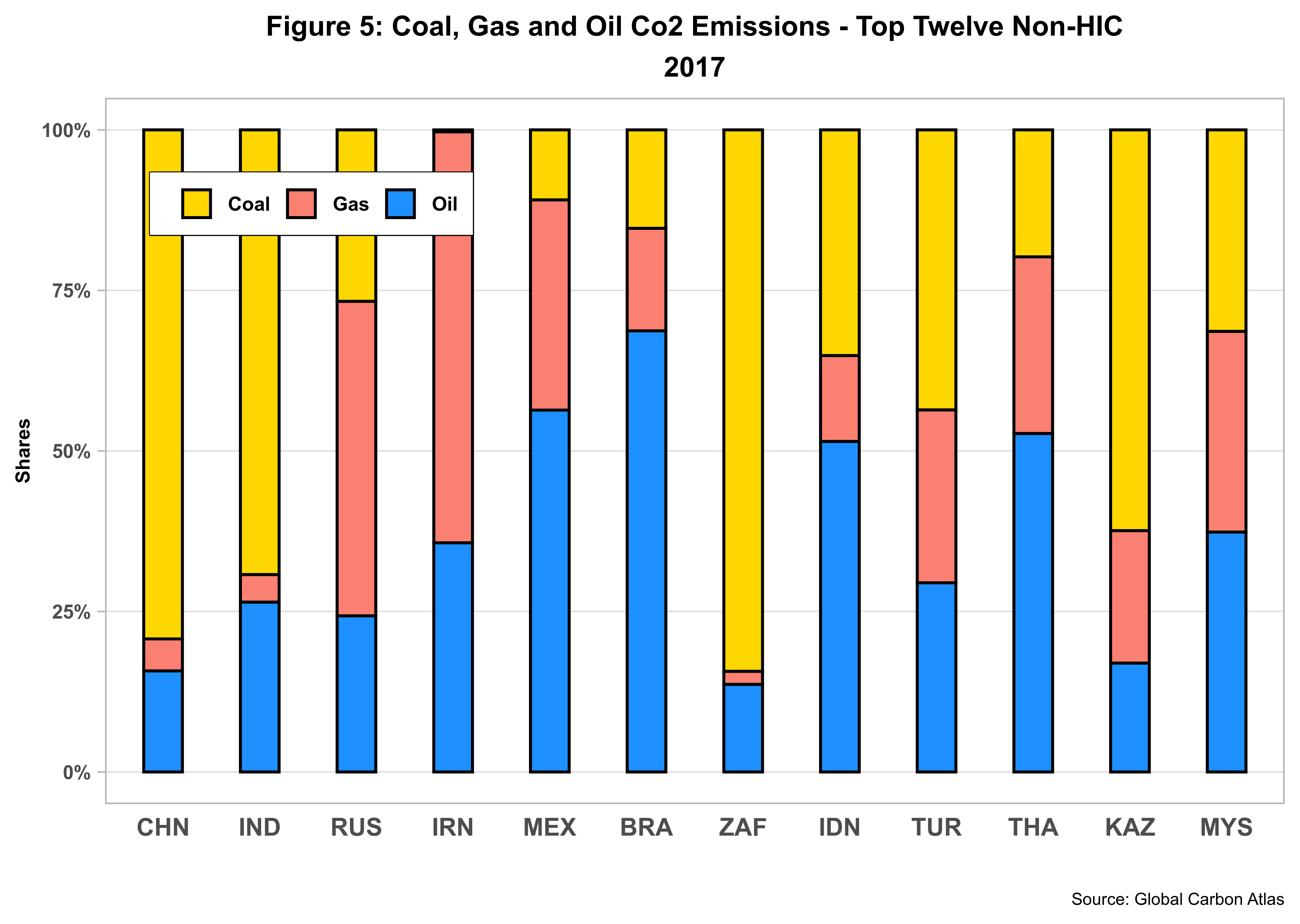 So are all emerging economies heavily reliant on coal? Figure 5 below provides some answers by presenting the emissions shares for coal, gas and oil for the top twelve countries, excluding all those classified as non-high income.
