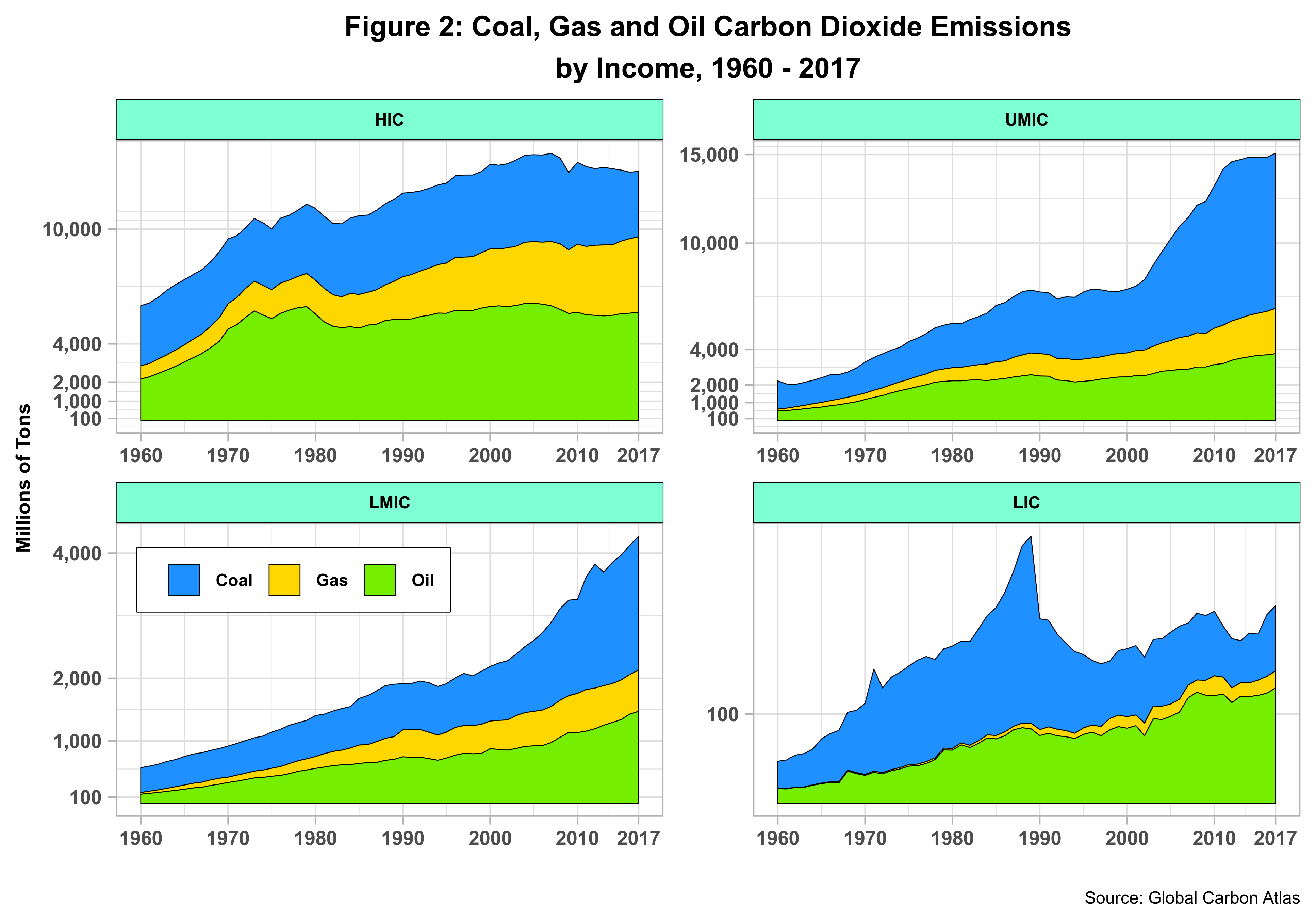 Here we can find the answer to our previous question. Both upper-middle (UM) and lower-middle-income (LMI) countries heavily use coal, whereas high-income countries (HIC) rely mostly on oil, with gas expanding rapidly and coal declining slightly. Low-income (LIC) countries also have oil as the primary source thanks to the decline in coal use by both North Korea and Zimbabwe, the latter having feel off the radar screen since the national crisis started several years ago. In any event, the total emissions for LICs are relatively small when compared to that of the other categories. LICs emissions are less than 1% of the total throughout the period.