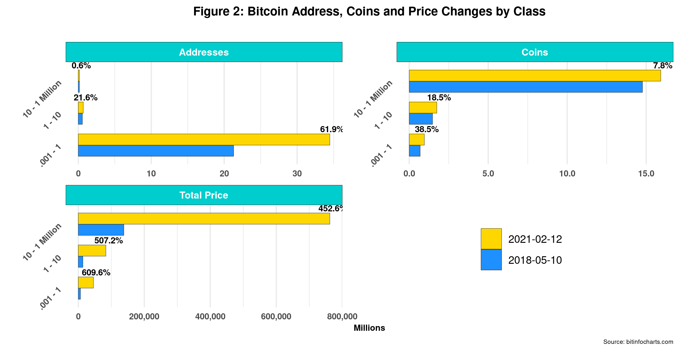 Figure 2 confirms our observation of overall class wealth increases, LC apparently being the main change engine in all three rubrics. Population growth is higher in the LC, as is the case in most countries. That indicates that access for newbies to the Bitcoin economy is more feasible at the lower levels of wealth. However, the rate of population growth in both LC and UC is higher than that of their respective portfolios, whereas the UC is just the opposite. So while wealth has increased in all classes, average individual wealth has, in fact, decreased. Average balances have decreased by 15% for LC and 2.7% for MC. The UC is having a ball, yet again, with gains of 6.7% per address. Finally, both coin and price distributions by class show that Bitcoin lacks a solid middle-class usually the largest in industrialized countries. Instead, Bitcoin seems to be part of the Global South given its class structure, LC being the most dominant.