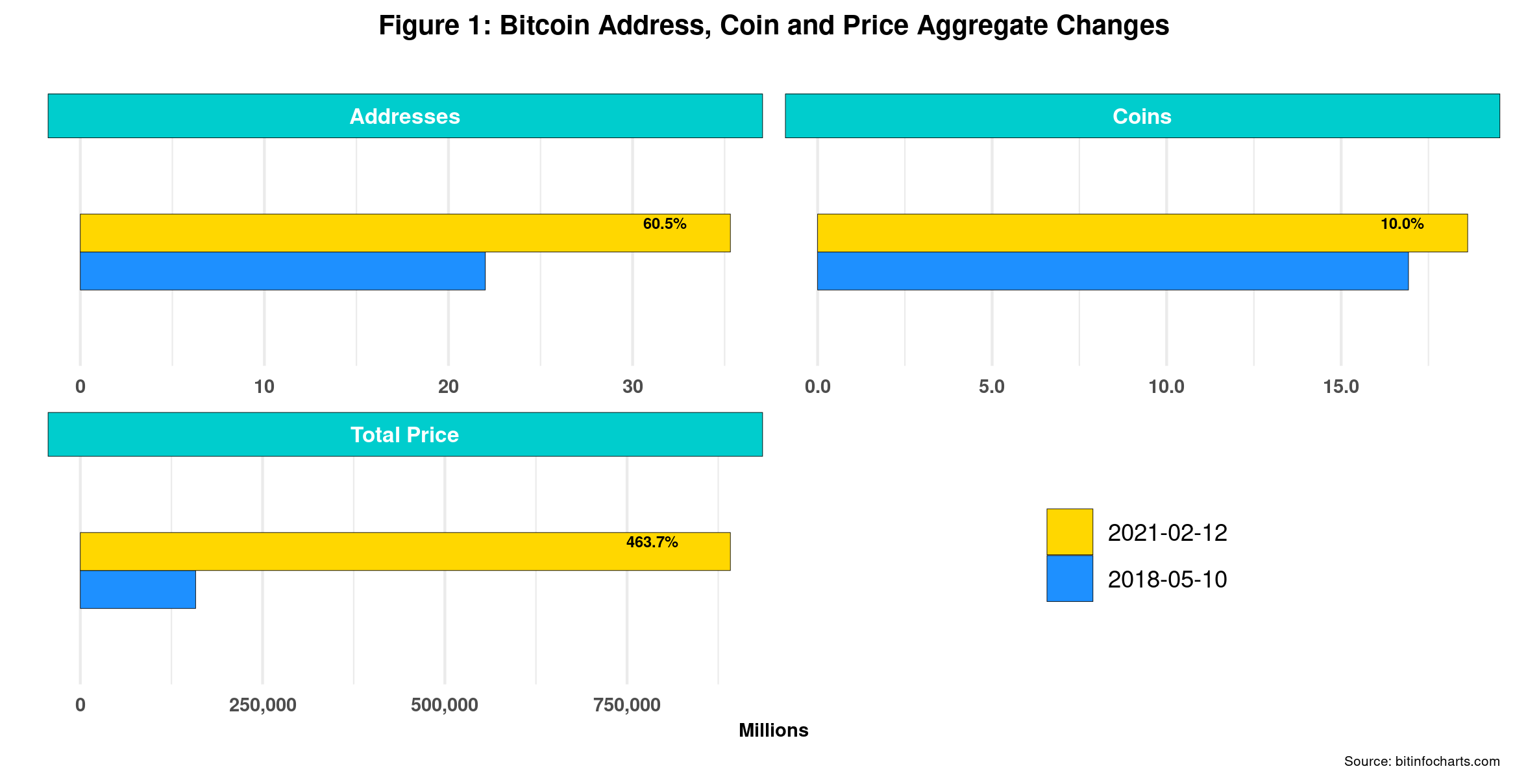The first thing to check is the overall changes in the Bitcoin economy, depicted in Figure 1.