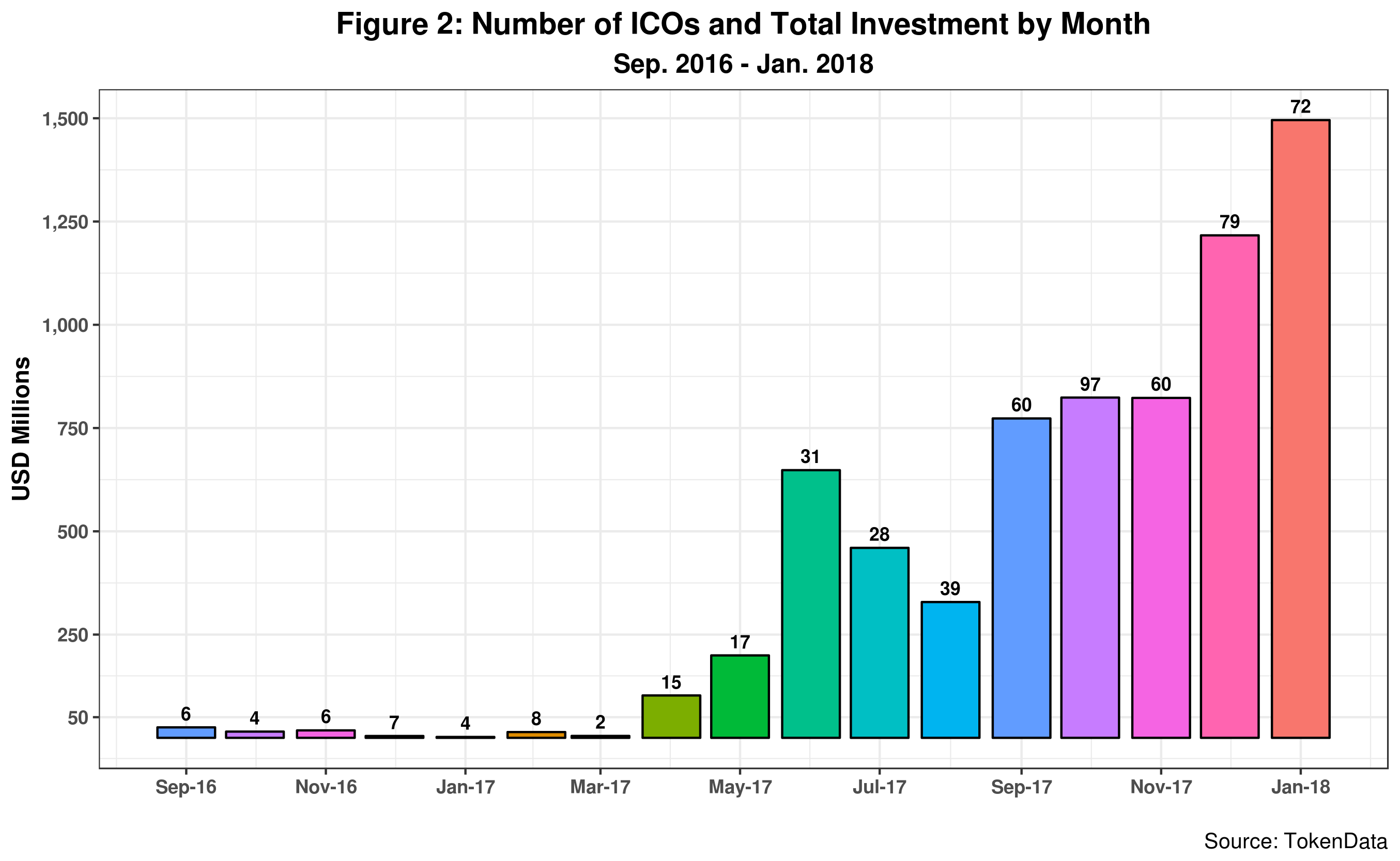 As seen in figure 2, the ICO spike started in April of last year. Total investment by month has been steadily increasing since September. While the most substantial number of ICOs took place in November with 97, January of this year is the most successful regarding funds raised with a total of 1.49 billion dollars. The data also reports 440 ICOs completed in 2017 that is indeed larger than the number of IPOs in the US for that same year but less than the almost 500 IPOs launched in 1999 during the peak of the dot-com boom.