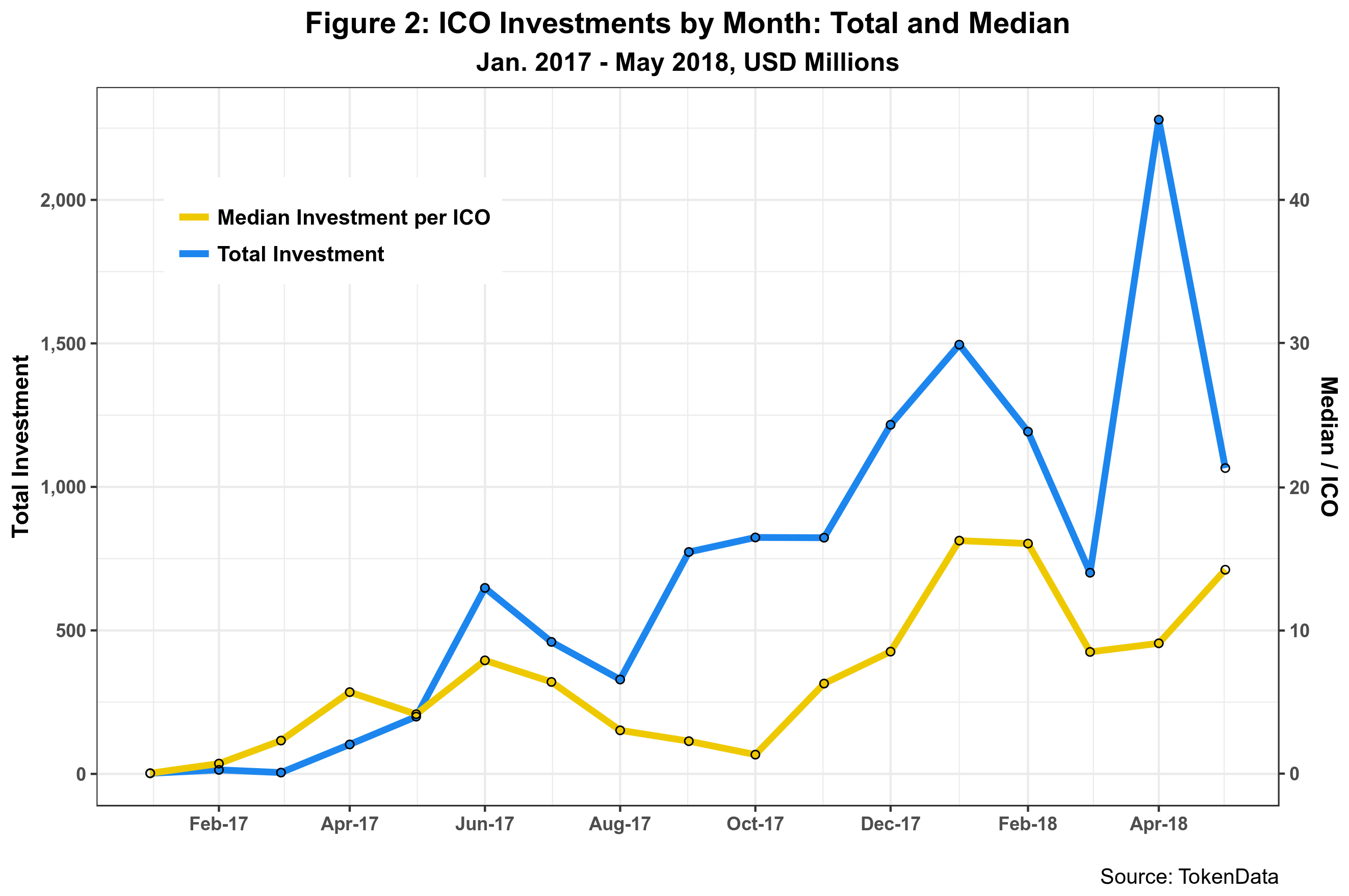 In the last three months, median ICO investment drop but then managed to recover in May as shown in Figure 2.