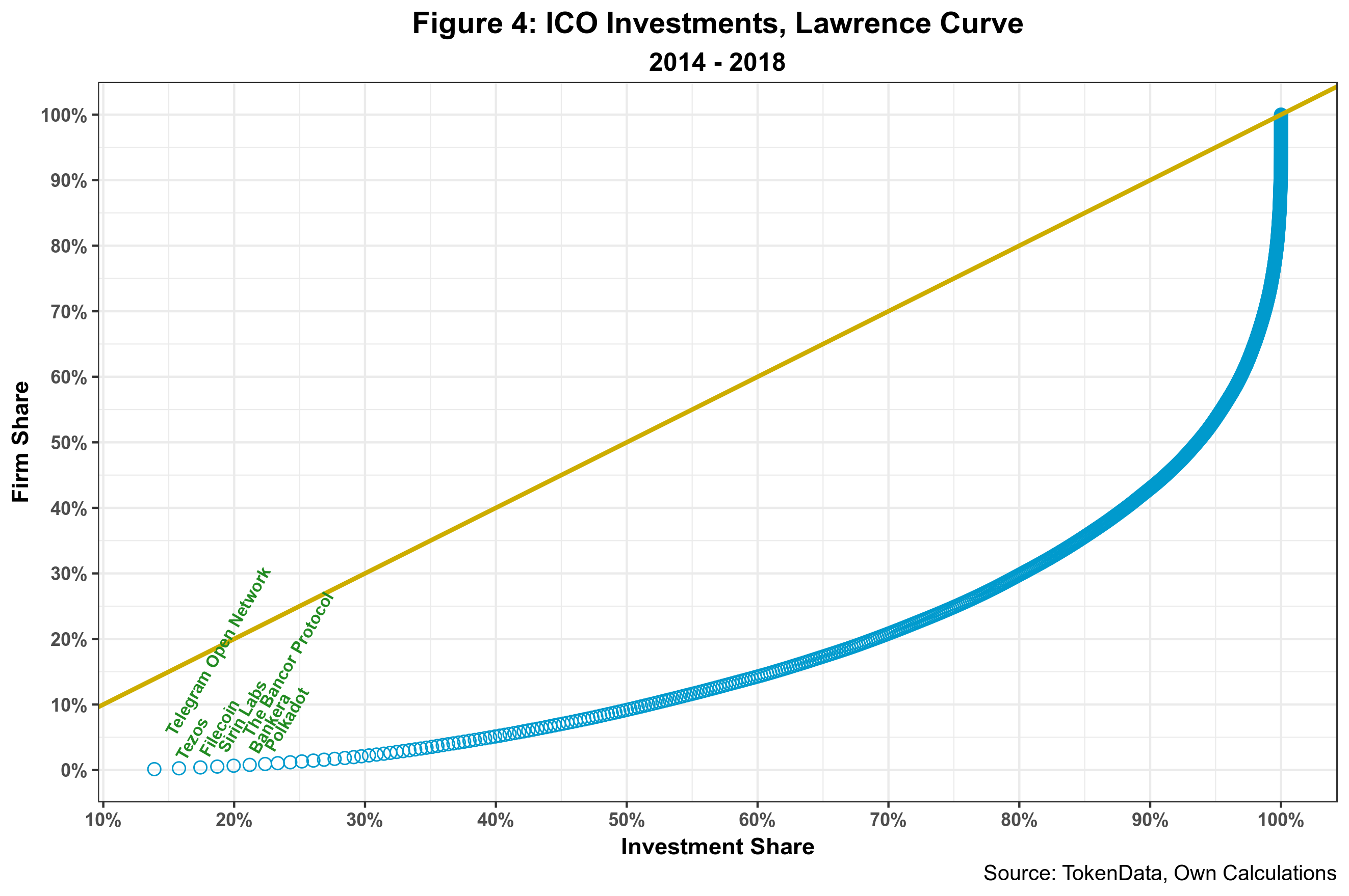 Telegram has had an enormous impact on the overall investment distribution as it represents close to 14 percent of the total. In fact, 1 percent of firms, the seven highlighted in the chart, has received 22.4 percent of all funds. Similarly, 10 percent attracted 52 percent of all funding.