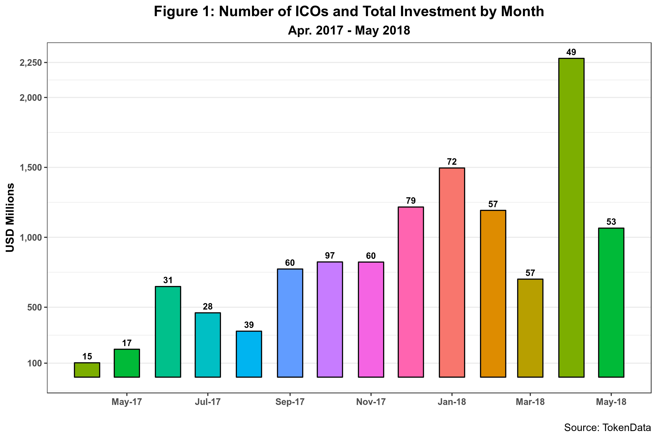 ending on 31 May. 159 ICOs were successfully completed between March and May raising over 4 billion dollars. The data includes the Telegram wh.ich collected over 1.7 billion dollars in spite of not holding a public ICO phase. Telegram can indeed be seen as a statistical “outlier” making last April the most successful month ever. Note that the number of successful ICOs did not increase overall. March matched February with 57 ICO but was much more skinny regarding resources. April and May are fatter but do not exceed the number of ICOs of the previous months. So the slowdown seems to be converging to a stable number of ICOs per month