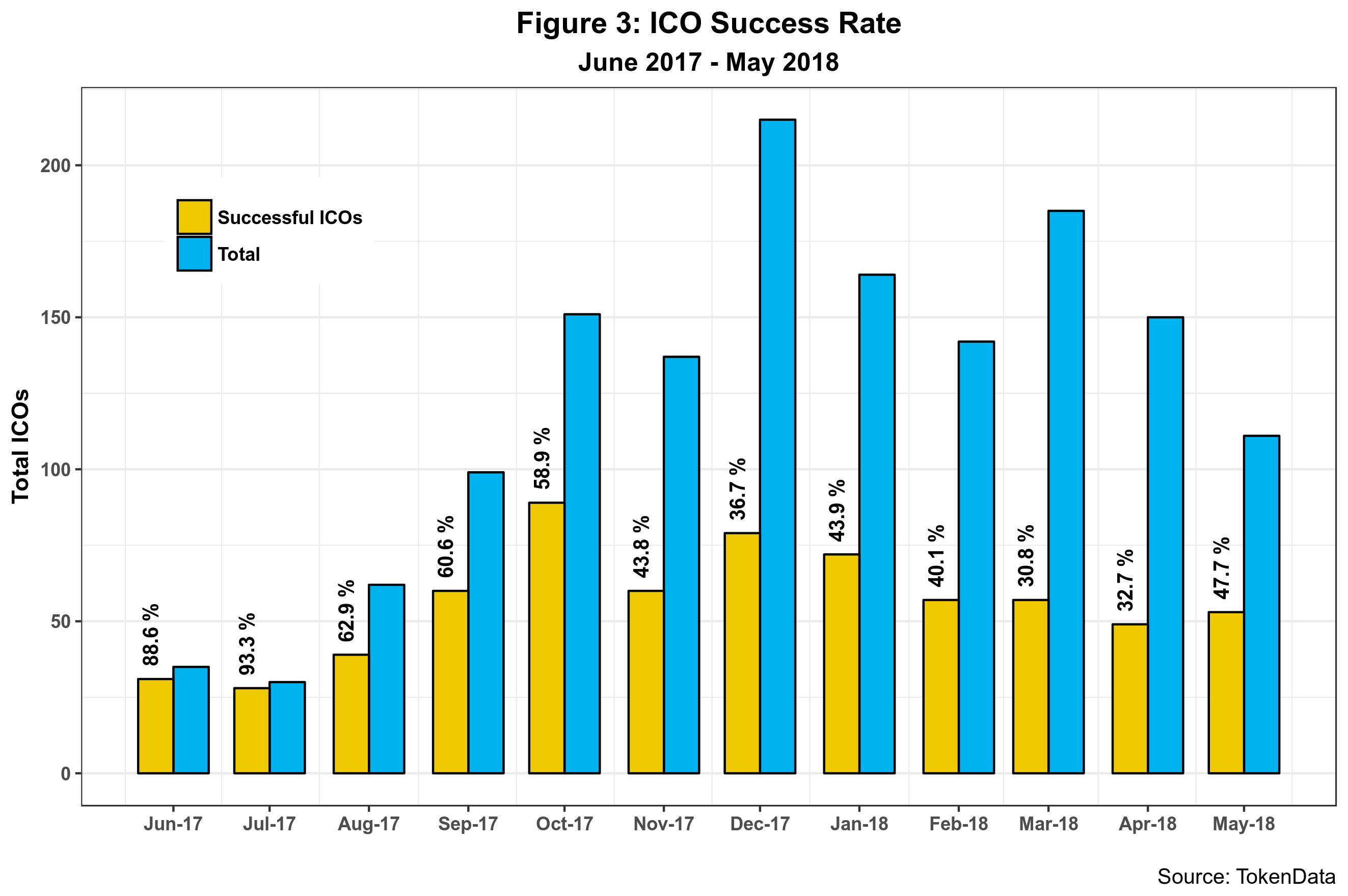 Figure 3 shows that the ICO success rate increased in May after 25 percent decline in the previous two months. In fact,