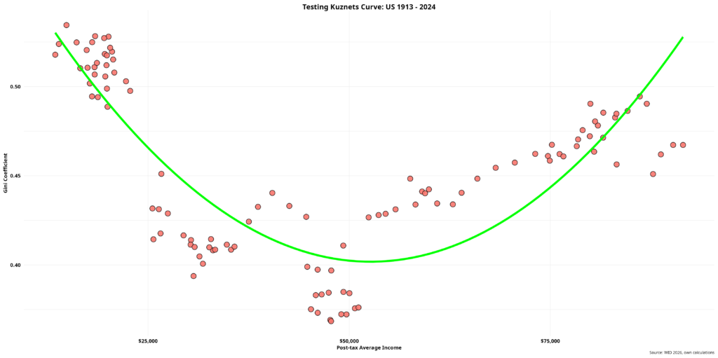 The connection between income and inequality has been revisited time and again. It traces back to the famous Kuznets’ inverted-U hypothesis: inequality rises in the early phases of development, only to recede as income crosses a certain threshold. Pinning down exactly where that threshold lies is notoriously tricky, since it depends on specific structural shifts in the economy. But before wading deeper into the theory, let’s take a quick look at the U.S.—the classic case study, thanks to its wealth of historical data, especially using the latest WID numbers.