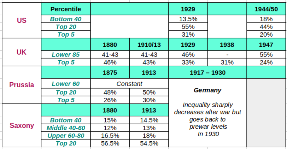 The data show that inequality in both the U.S. and the UK is declining, albeit faster in the former. Note that the U.S. data for 1950 is the average Kuznets computed from previous years starting in 1944. From the U.S. data, we can calculate the middle 40-80 percentile to then create the lower 80 percentile. That number is 45% income share for 1939 and 56% for 1950. That is strikingly similar to the UK’s lower 85th percentile for comparative years. In other words, income inequality declines faster in the U.S. and reaches levels similar to those of the UK, which took more than twice as long to get there. The case of Germany and its regions is clearly unique. Income inequality is fairly stable until 1913. It then decreases after the war but rises again after the 1929 economic crash. Therefore, we cannot say that income inequality is decreasing.