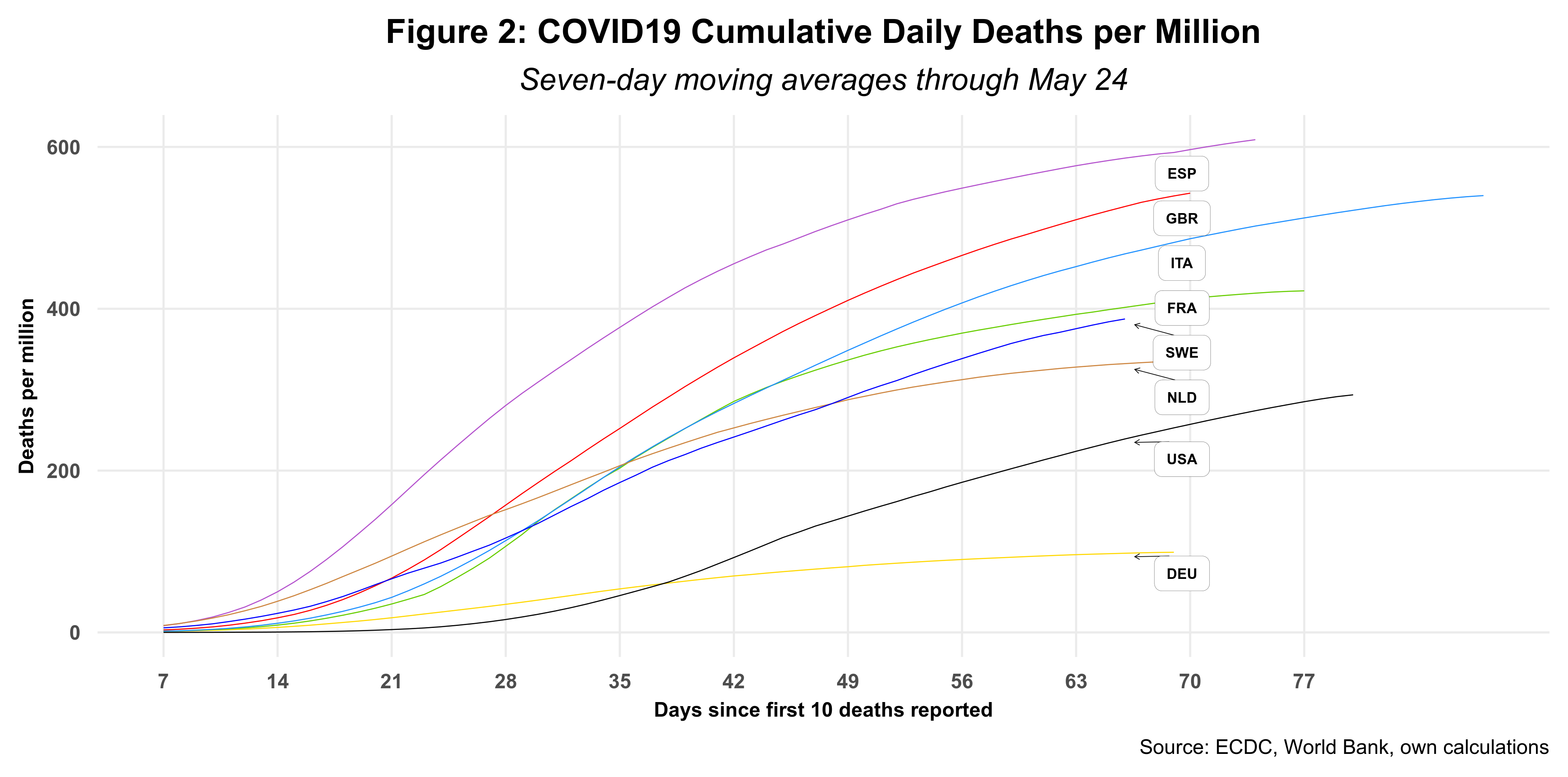 Figure 2 looks at the evolution of cumulative daily deaths per million inhabitants.