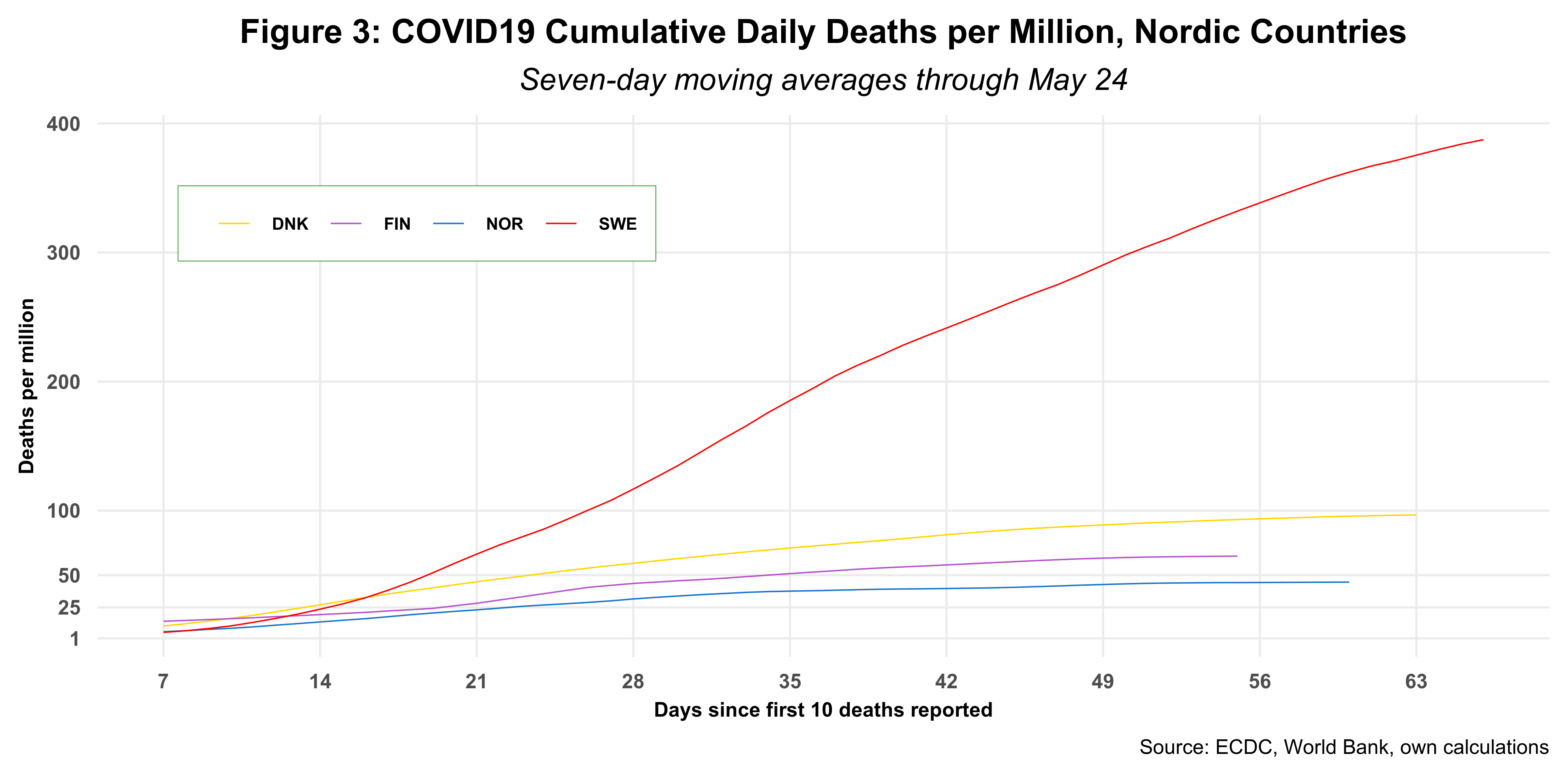 Figure 3 compares Sweden to three other Nordic countries, all of which adopted lock-down measures. The graph speaks for itself.