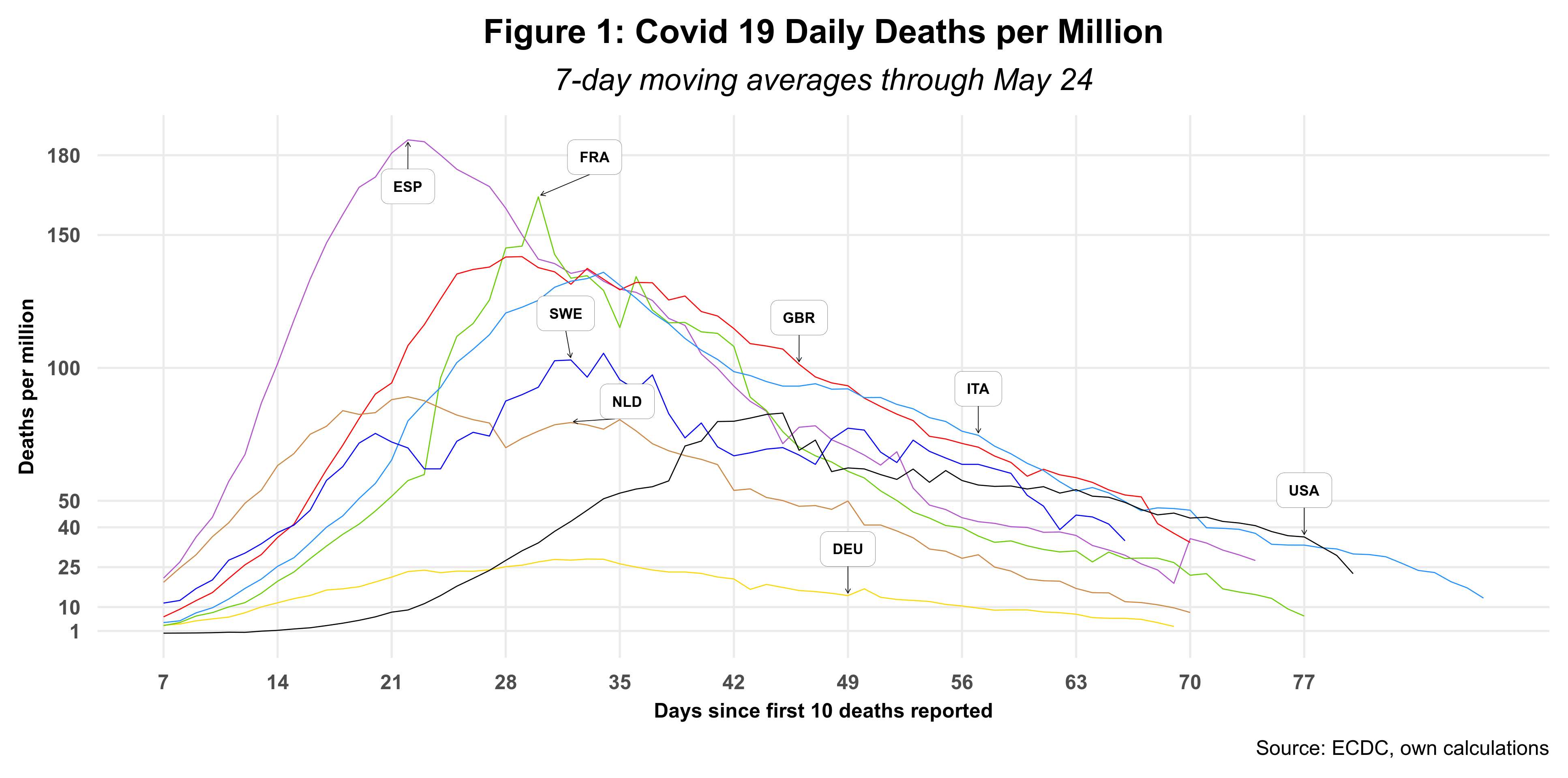 Normalizing the data by population size is essential if the goal is to compare countries. Sweden has a population of 10 million that is eight times smaller than Germany’s and 1/32 of that for the US. A rapid upswing in deaths followed by a rather slow decline is the typical pattern for all these countries. After three weeks since the first ten deaths were recorded, Spain, the UK, the Netherlands and Sweden reported the fastest acceleration. By week seven, Sweden had already overtaken Spain and was just behind the UK and Italy. And by 24 May, Sweden had surpassed all other countries reporting the highest daily mortality rate – all now in decline. Germany, on the other hand, has had a unique evolution characterized by consistently low rates of mortality throughout the pandemic.