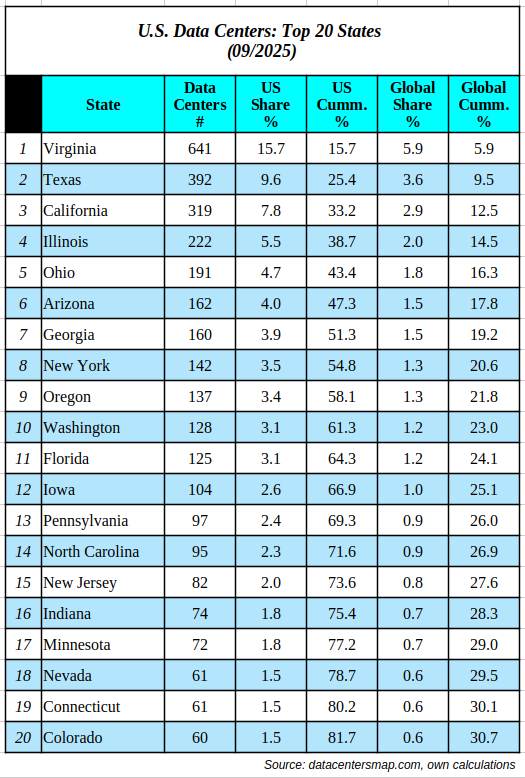 We already know that the U.S. is an outlier, as it hosts nearly 39% of all data centers worldwide. So, where exactly are these noisy and thirsty factories located? The table below depicts the distribution for the top 20 states in the country.