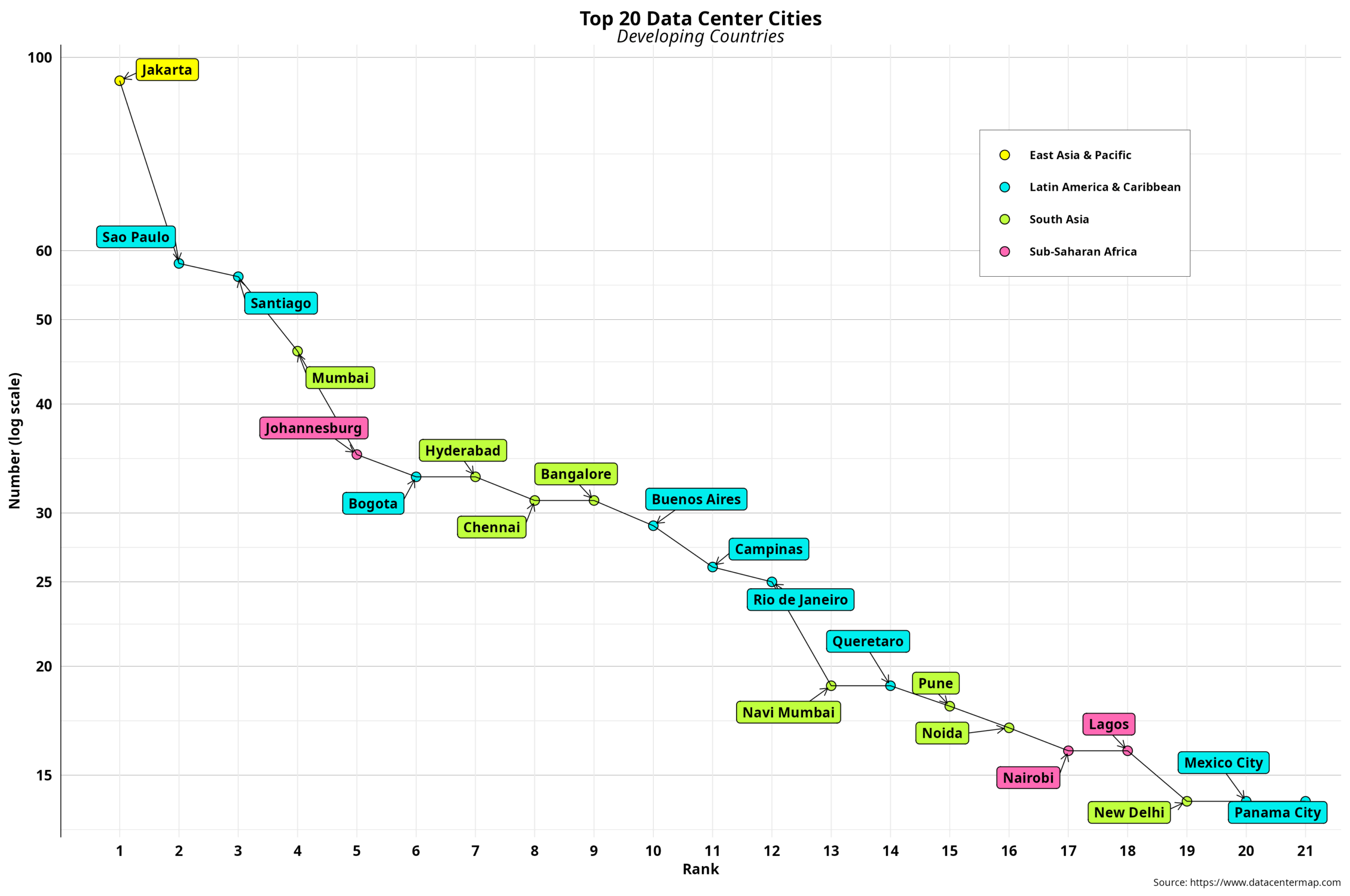 Jakarta is the “Dallas” of the developing world, with 94 data centers. São Paulo and Santiago follow from a distance, with 58 and 56, respectively. In addition, India has the most cities, with eight, followed by Brazil with three and Mexico with two. Sub-Saharan Africa finally shows up with three cities, led by Johannesburg, which, in turn, is well ahead of Nairobi and Lagos. Note also that only the three top cities have more than 50 data centers, while those at the bottom record low numbers, certainly when compared to the top cities globally.
