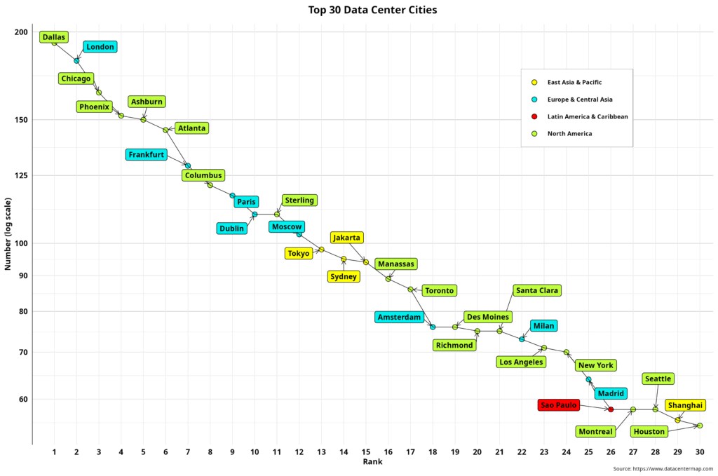 The chart below depicts the world’s top 30 data center cities. Here, we encounter a few surprises.