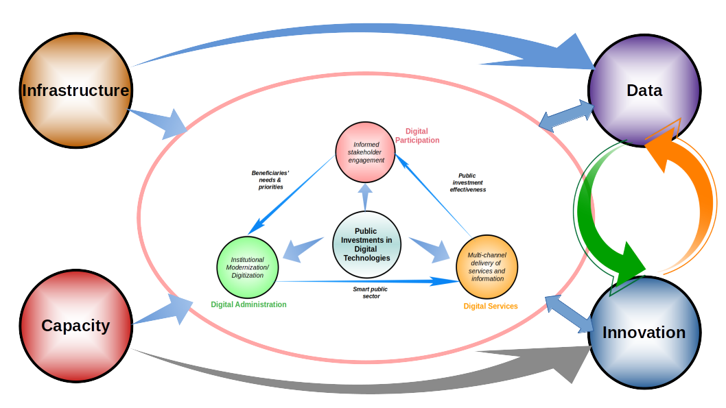 - Capacity. Overall human capacities and skills as well as institutional ones. They should not be limited to technological capacities. Instead, policymaking, managerial and administrative capacities must be part and parcel of the process to ensure digital technology investments deliver the goods for the public sector. Citizens should also have the capacity to interact and engage with the public sector effectively. Governments are but one of the actors here, though they have a fundamental role in strengthening public entities’ institutional capacities.