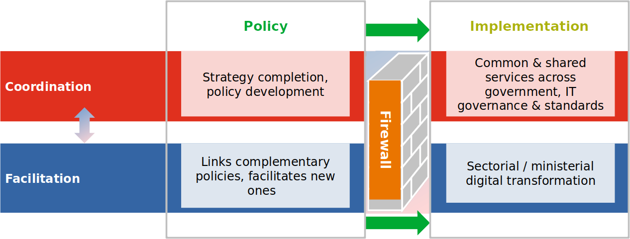 Functionally, it is crucial to distinguish between policy and implementation in terms of processes. Similarly, the distinction between coordination and facilitation is essential when focusing on agency and participation within the process. While policy should lead to implementation – and not the way around, coordination and facilitation, albeit interlinked, demand different governance arrangements. For example, line ministries can lead their digital transformation in function four, while the entity overseeing actual implementation plays a facilitation role.