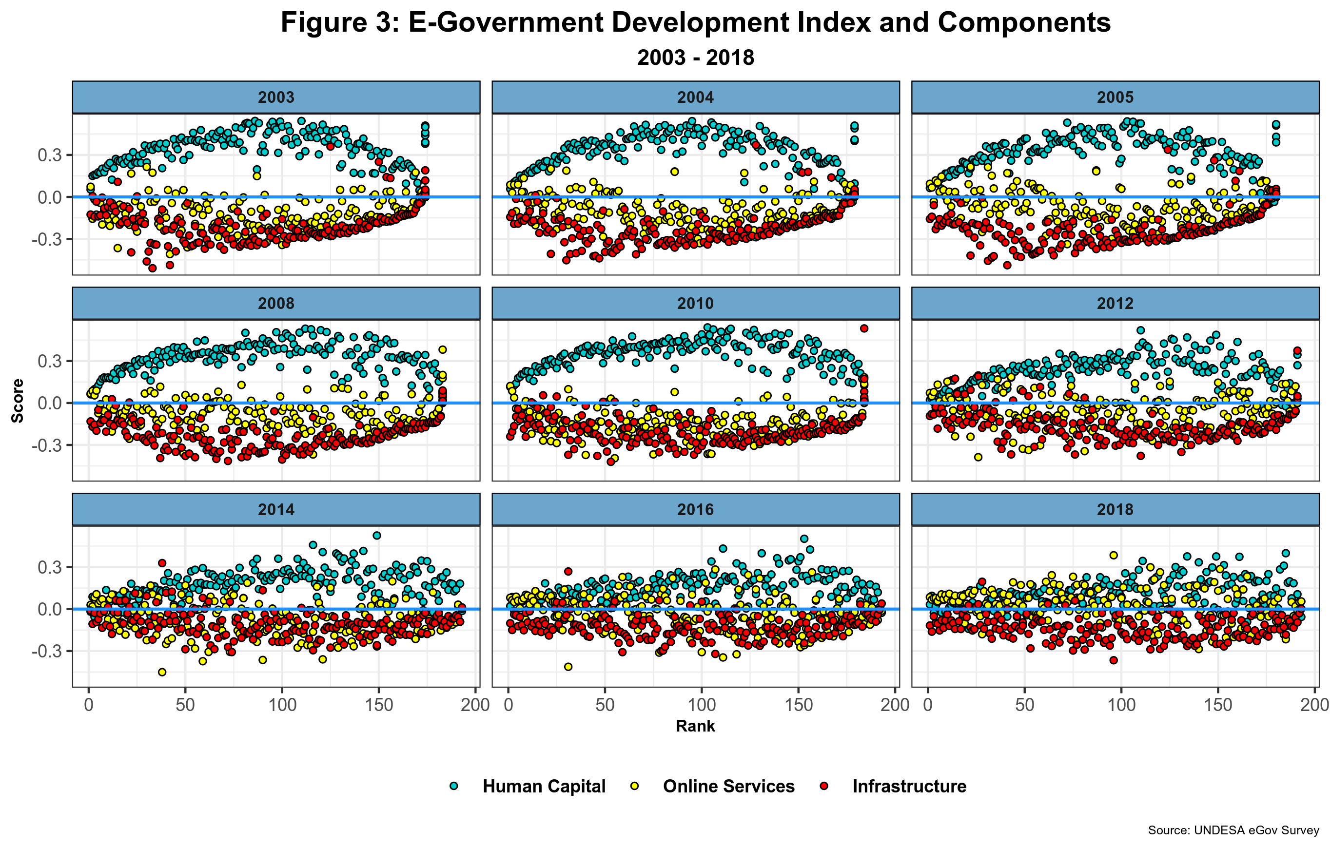 Changes in the way the subindexes are compiled partly explain these changes. The human capital calculation was changed in 2014 by adding two additional indicators leading to a relative decrease in overall scores. Telecom infrastructure has also been modified first in 2008 by dropping TV sets and then in almost every report until 2018 – emphasis now placed on broadband access and wireless connectivity. Recall that the online services subindex is directly estimated by UNDESA and relies on both member state inputs and comprehensive analysis of national government websites. Improvements in both the methodology and data collection have probably led to the dramatic shift in this subindex, but a full and more detailed explanation will demand a thorough analysis of the data series. The convergence process could be the result of real improvements in the various indicators aggregated within the EGDI, especially when it comes to telecom infrastructure. But explaining why human capital is decreasing is perhaps a bit more challenging unless we assume the early years were foreshadowed by great optimism.