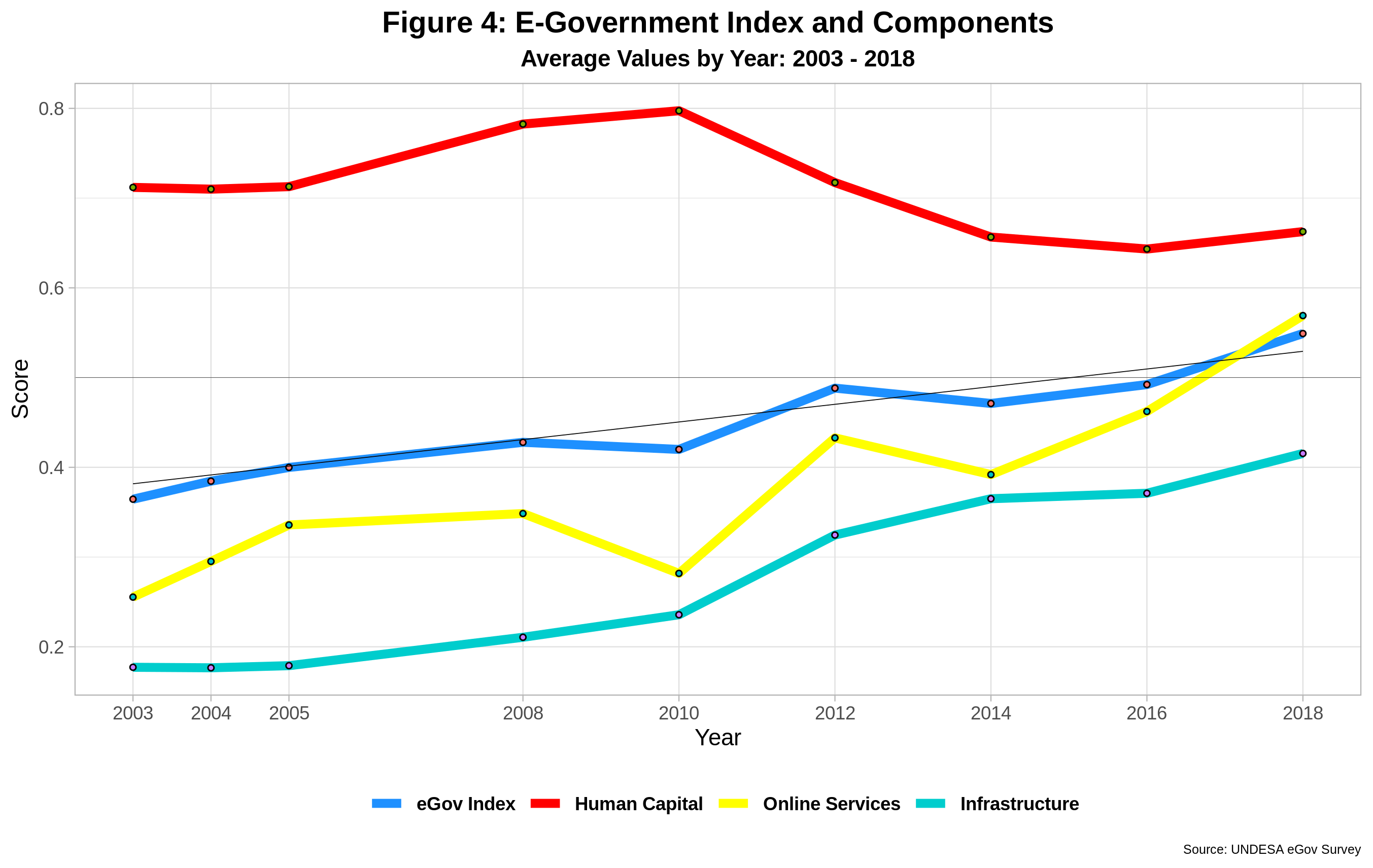 We thus have a situation where the steady growth in EGDI has been accompanied by a relatively significant decline in human capital indicators across the board. In the end, gains in EGDI have relied on the growth of both online services and telecom infrastructure with the former being the prime mover in the last four years. A simple regression analysis of the EGDI and its components indicates that online services account for 37% of the changes in EDGI. On the other hand, the e-participation index growth beats online services as the former has risen almost 200% since 2010 but does not directly factor into EGDI calculations. The reason for such rapid growth is not apparent, however.