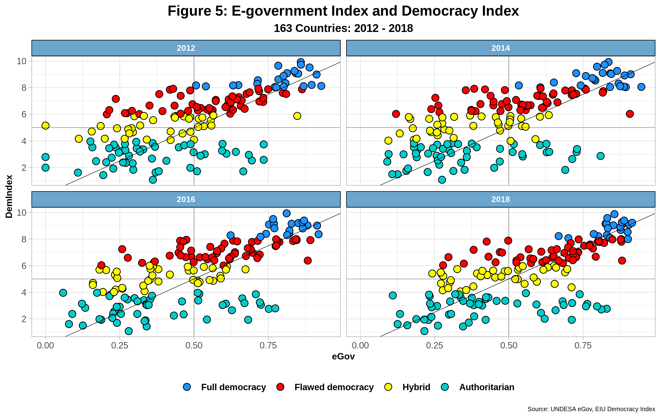 The graph intuitively shows a positive linear correlation between the two indices, which indeed amounts to 0.67, slightly higher than that between EGDI and GDP per capita, mentioned in the previous post. That is, the higher the degree of democratic development, the higher the EGDI score. Nevertheless, there are also quite a few “outliers,” especially for both flawed democracies (an unfortunate label for sure!) and authoritarian regimes. A bunch of countries under the latter rubric are excelling when it comes to EGDI, and their number has steadily increased since 2012. Some even outperform fully democratic nations. On the other hand, flawed democracies with relatively high democracy index scores, some even close to full democracies, are underperforming in terms of e-government development. By the same token, more than 50% of all hybrid regimes have EGDI scores below 0.5.