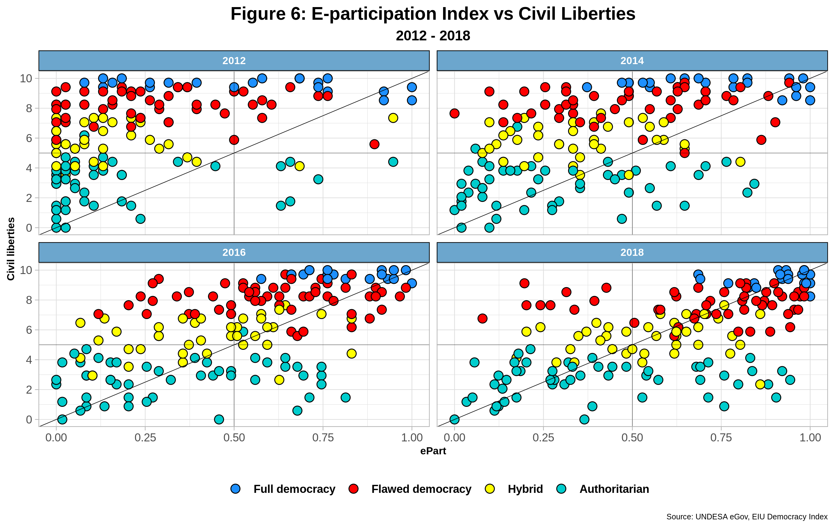 Civil liberties are one of the five pillars of the democracy index. It includes the existence of free media, electronic included, restrictions to accessing the internet, freedom of expression, and institutional mechanisms that allow citizen’s redressing, among others. In other words, the indicator provides an overall perspective on the local environment that either promotes or deters stakeholder interaction with governments and others. Figure 6 depicts the interaction between e-participation and civil liberties for the 2012 – 2018 period.