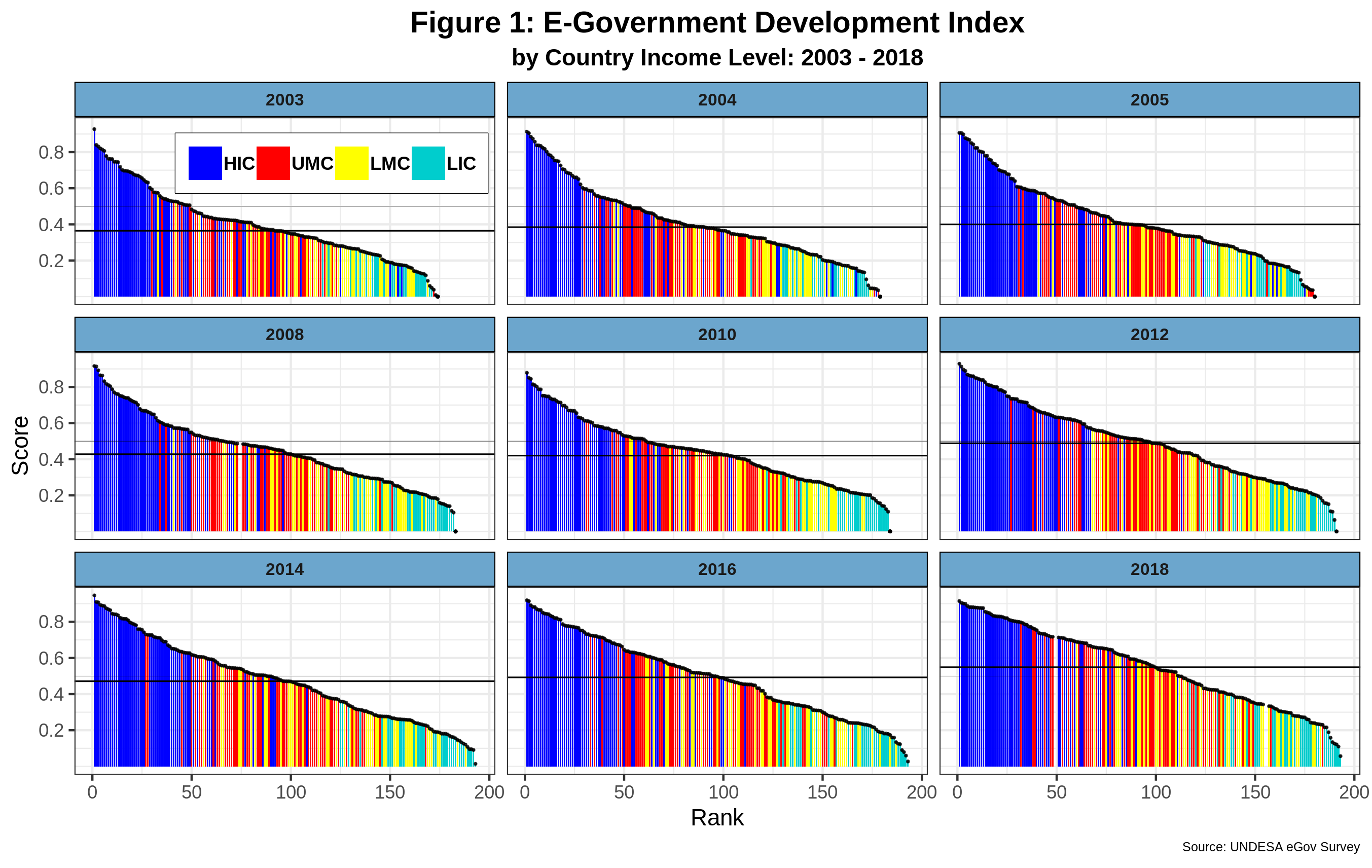 The e-government development index (EGDI) is the leading indicator produced by the organization. Note that the index is not supposed to be an absolute measurement of e-governments. Instead, it is a relative score that aims to show the differences among countries regarding the implementation of digital technologies by the public sector. Figure 1 below depicts the evolution of EGDI since 2003, countries covered classified by World Bank income categories.