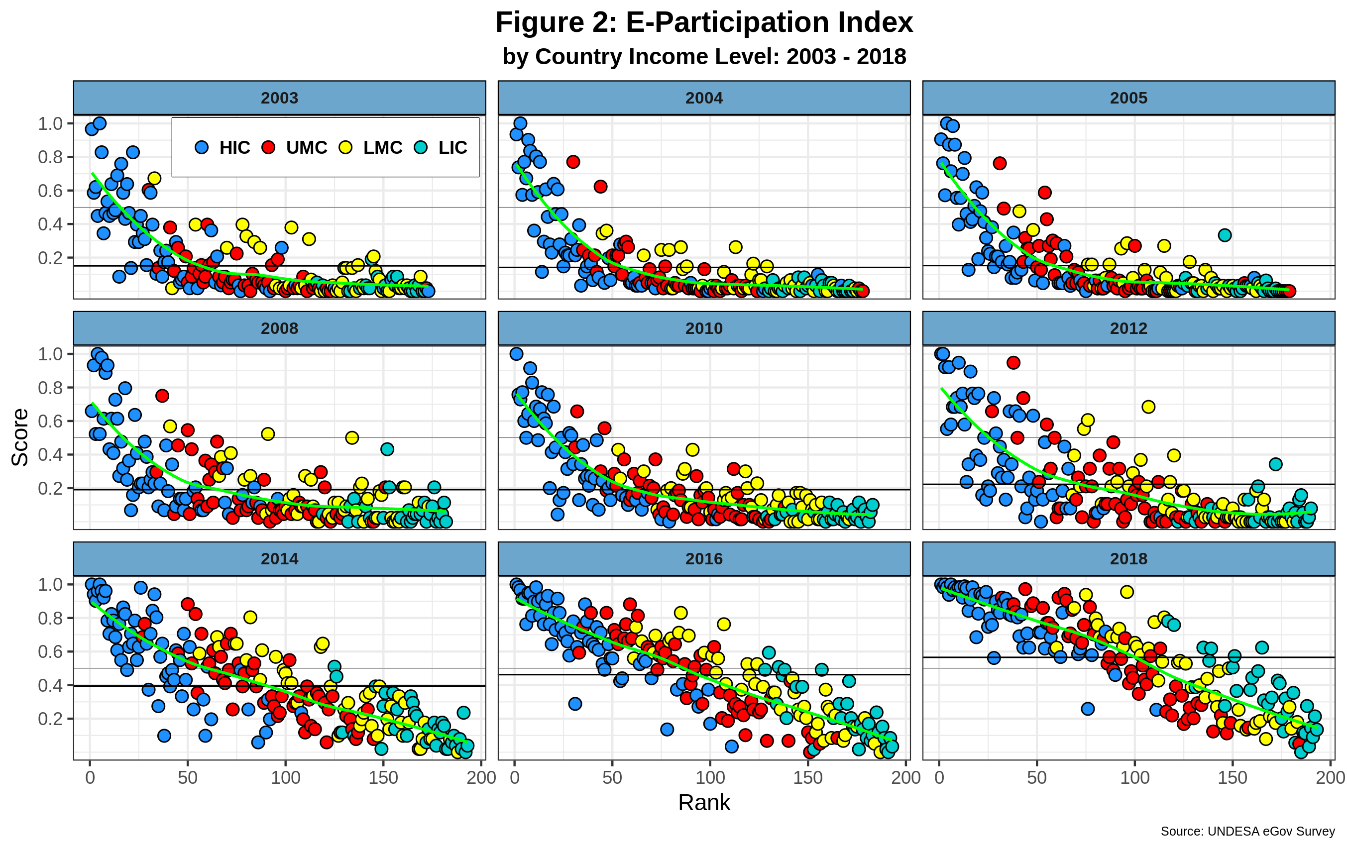 EGDI and EDI are thus walking in different paths, which is surprising as data collected for their estimation comes from the same sources. Recall also our overarching definition of e-government where citizen engagement is one of its three core pillars and should thus work in sync if e-government is to progress in the medium term. Part of the issue here stems from the fact EDI is measured via the qualitative assessment of government websites and is thus supply-side centered. But assessing sophisticated forms of e-participation such as decision-making do need to factor in the demand side too. Otherwise, governments can create a plethora of e-participation sites to increase EDI scores, while real stakeholder engagement is minimal or, in extreme cases, even mandatory.