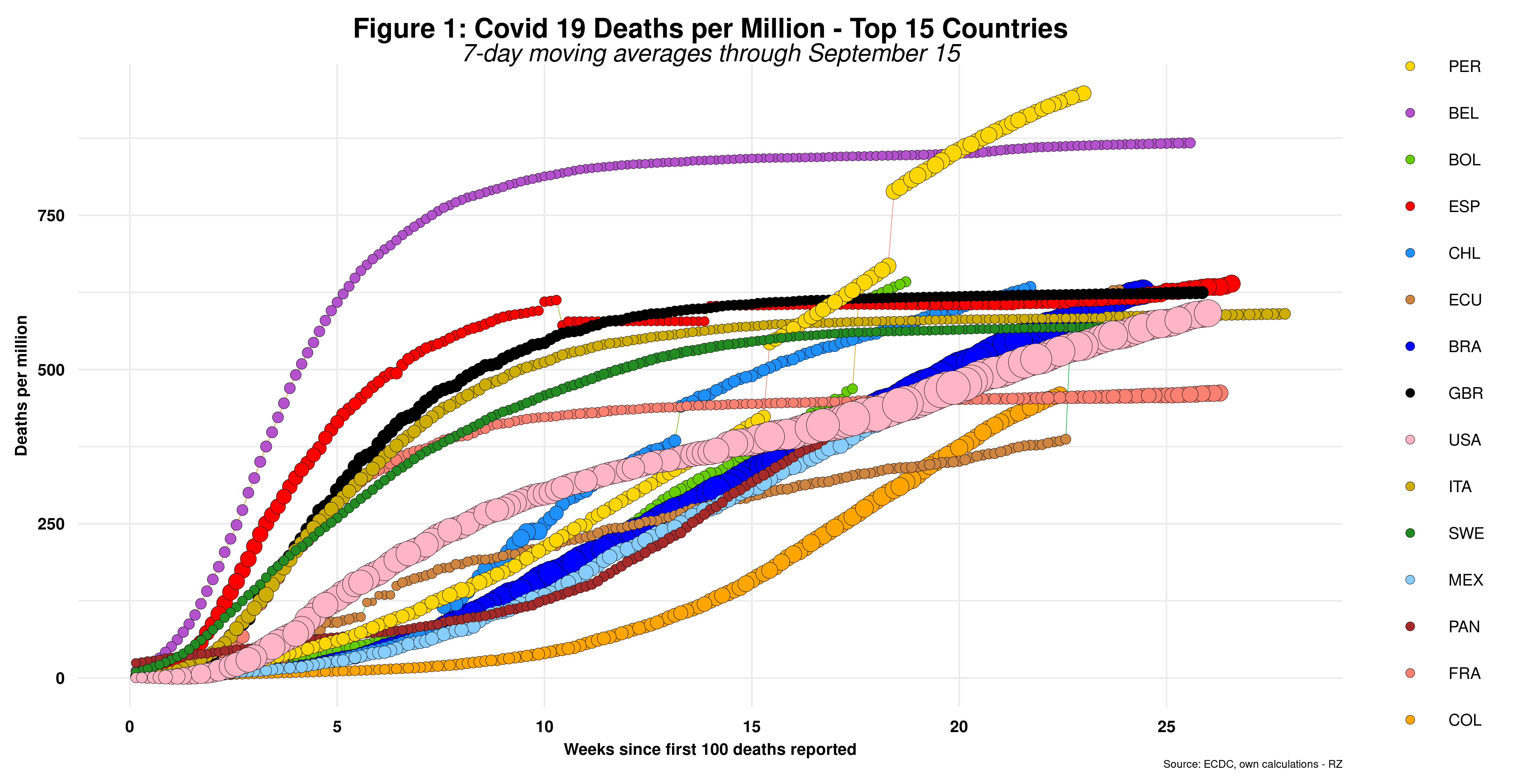 As shown in figure 1 below, several Latin American countries are now in the top 10 when we account for COVID-19 deaths per million inhabitants.