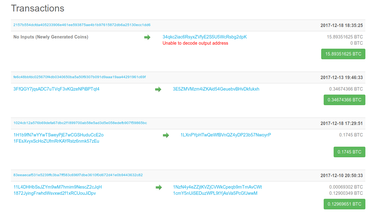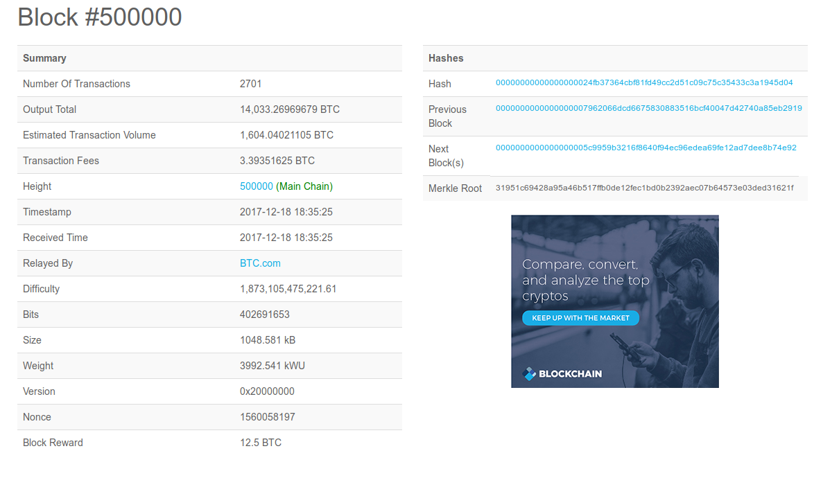 Blockchain.info provides web-based access to the Bitcoin blockchain. Let us look at block 500,000, which was added last December. The web page has two main sections. The header or summary of the block is at the top, as we can see on the screenshot below. A combination of accounting data with more technical terms such as hash, nonce, and difficulty, among others, is presented succinctly.