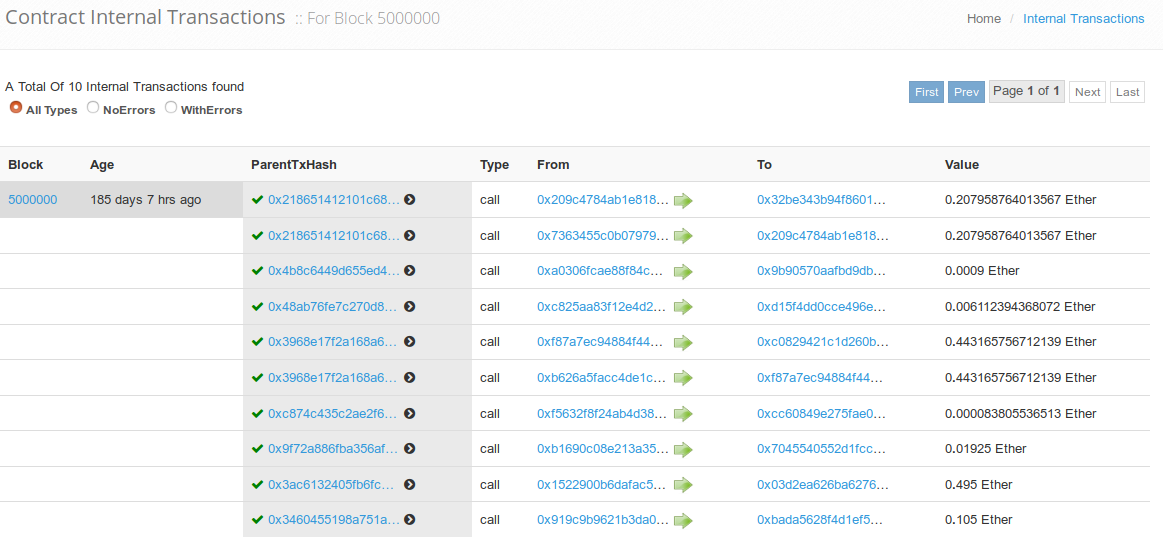 Etherscan.io provides similar functionality for the Ethereum blockchain. Looking at block 5,000,000, we will see that the header and summary portion contains more information than Bitcoin, such as gas, sha3uncles, and uncle blocks, to name a few.4 Do not worry about these terms,` but feel free to Google them if interested! Block 5,000,000 includes 109 transactions and ten smart contracts, which are shown in the screenshot below.