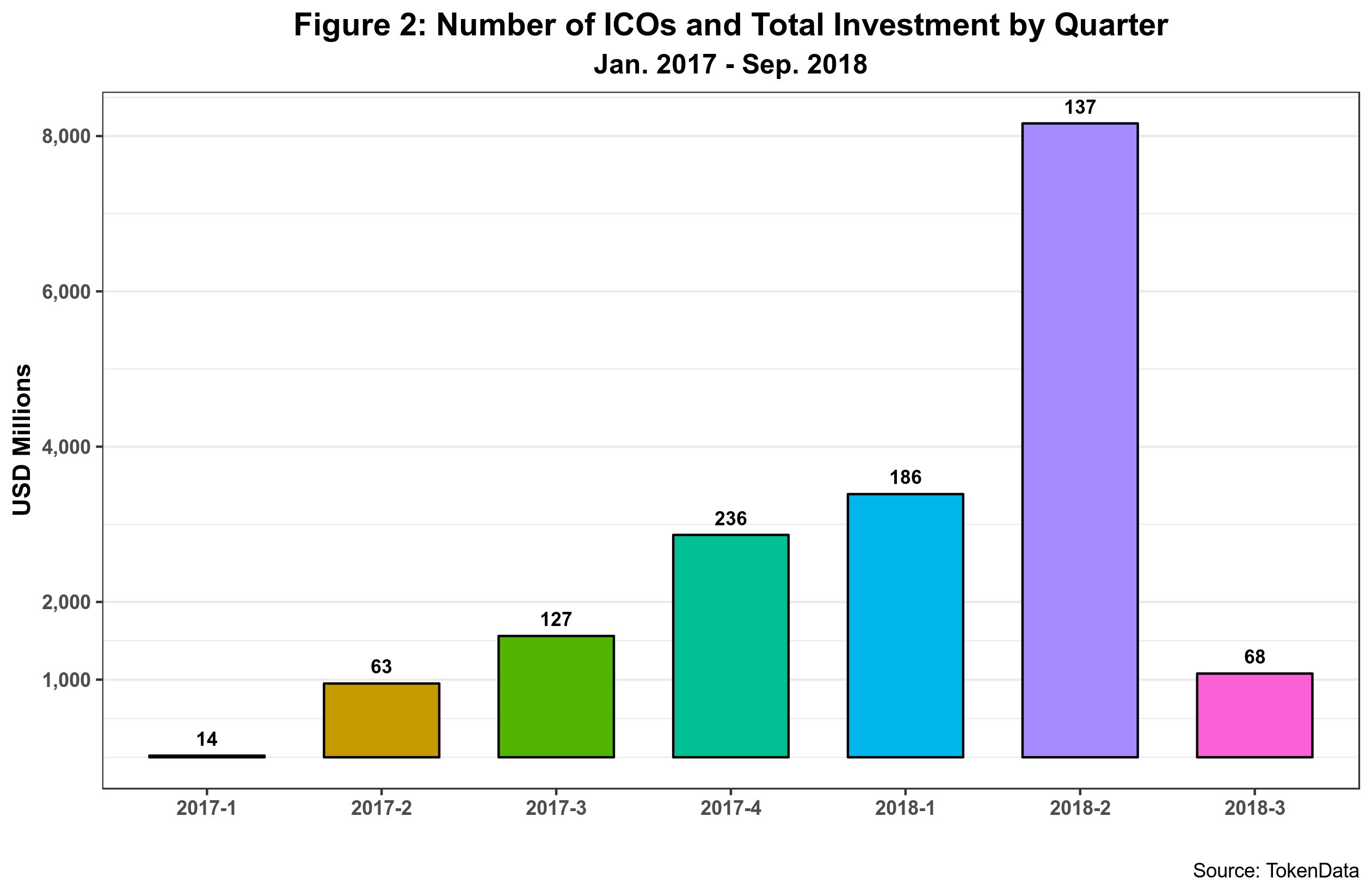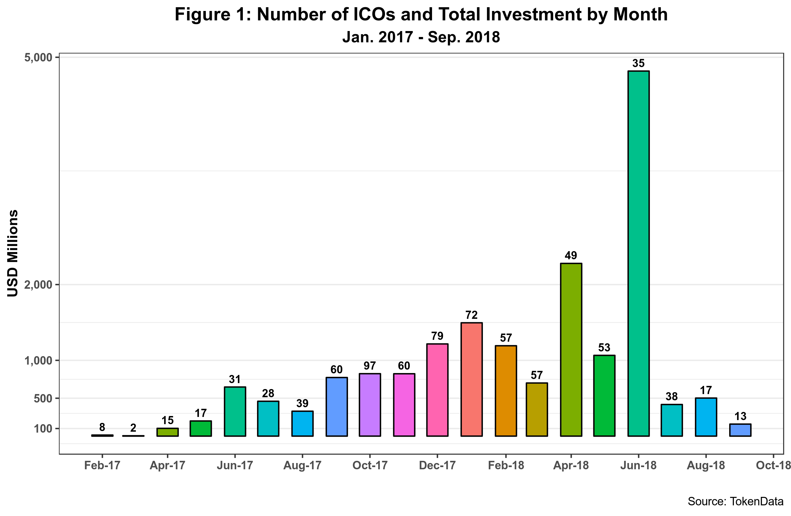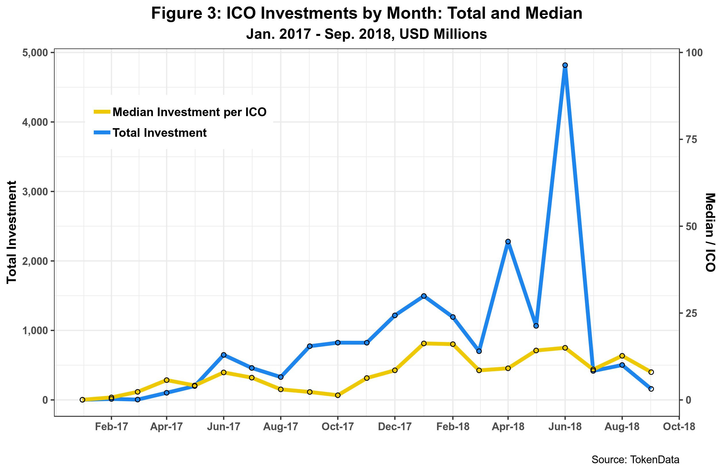 Figure 1 above cleanly captures the declining trend regarding both the number of ICOs and total investment attracted. June 2018, however, takes top honors as the month that holds the record for most investment since ICOs started. The one-year EOS ICO process is the culprit here. This ICO alone received over 4.2 billion dollars (the largest so far), representing 88% of the total funds invested in ICOs during that month. If EOS is excluded from the data, then it is possible to conclude that ICOs have been falling since April. On the other hand, September 2018 is now almost at the same level as April 2017.