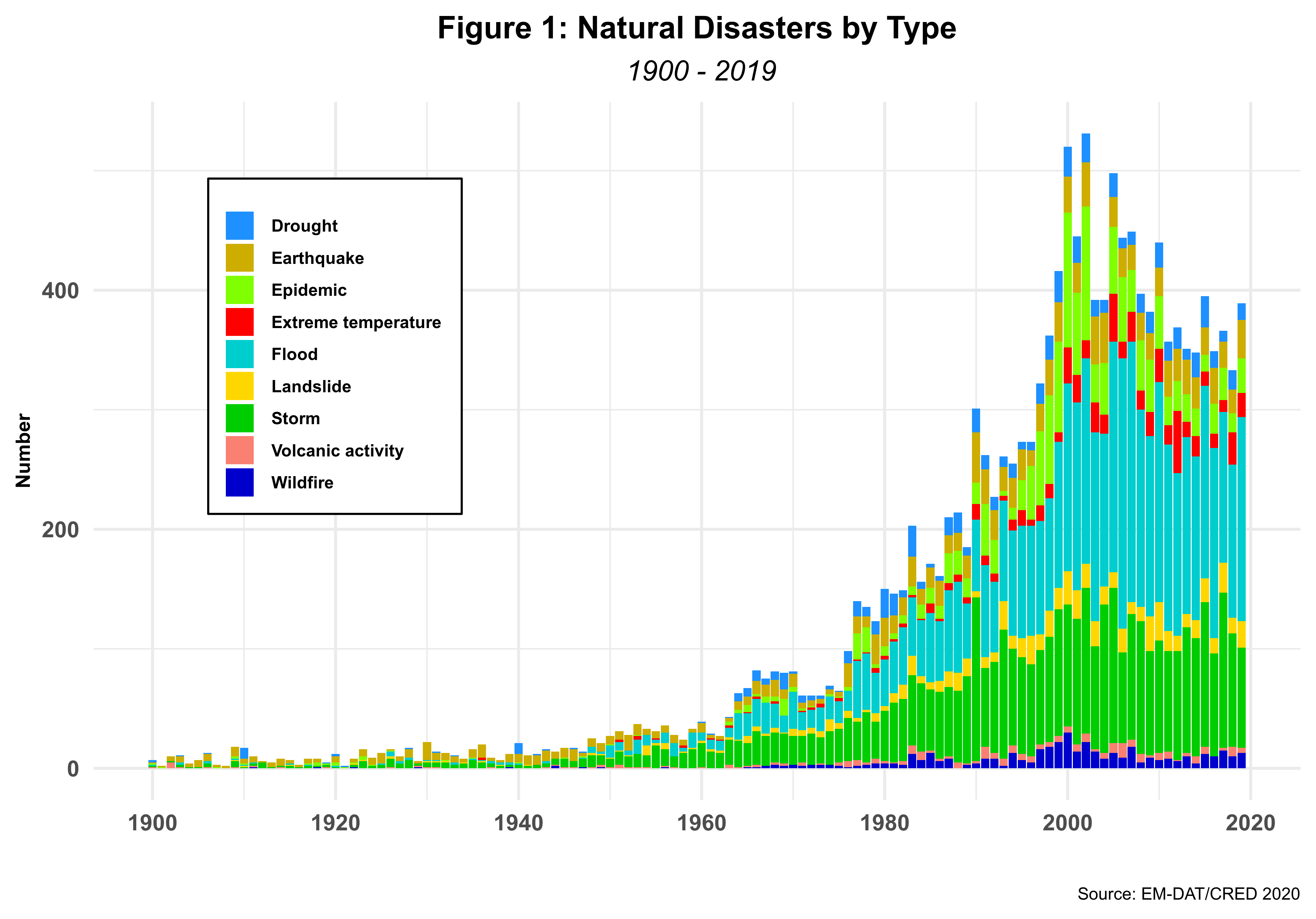 EM-DAT classifies disasters under three categories. 1. Complex disaster. 2 Technological disasters. And 3. Natural disasters, the latter comprising 63.3 percent of all events. Figure 1 below presents the evolution of the various types of natural disasters since 1900. To simplify a bit,