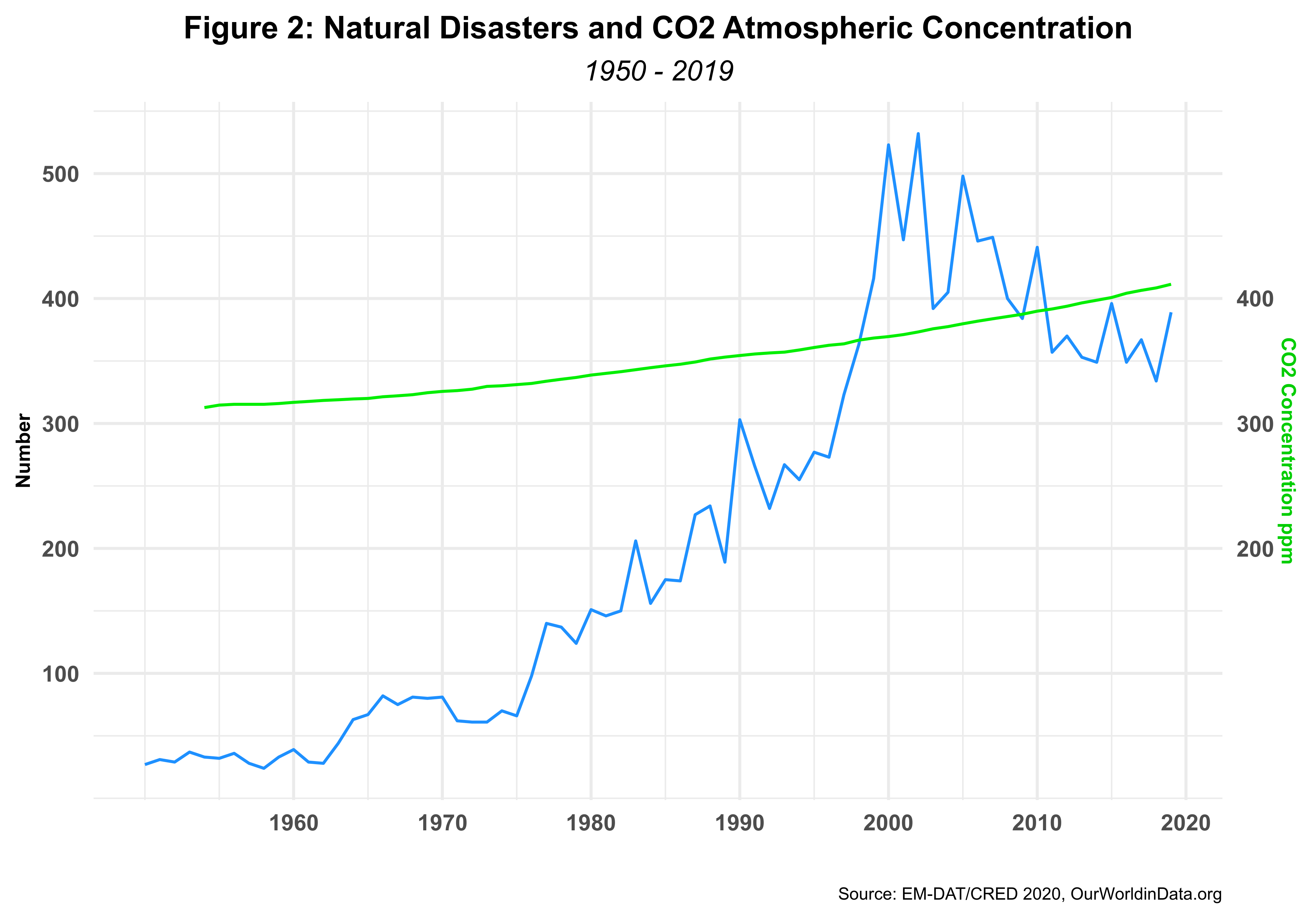 The 1960s are also the host to the now well-known acceleration of CO2 atmospheric concentration. Figure 2 graphs the relationship between natural disasters and CO2 concentration, starting in 1950 and includes all natural disaster types.