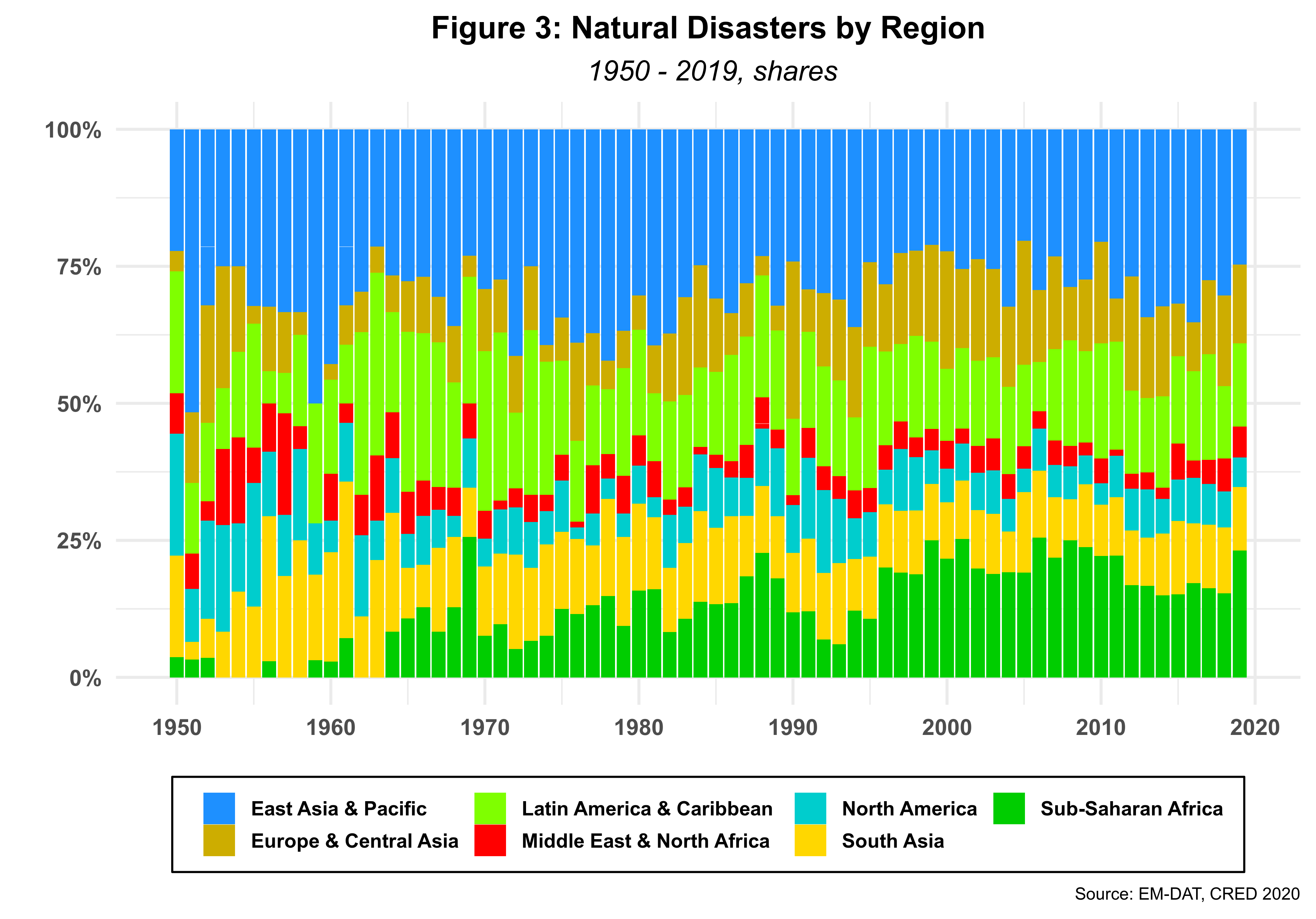 Nevertheless, note that Asia seems more prone to such events. Is this so? Figure 3 depicts the share of natural disasters by core regions.