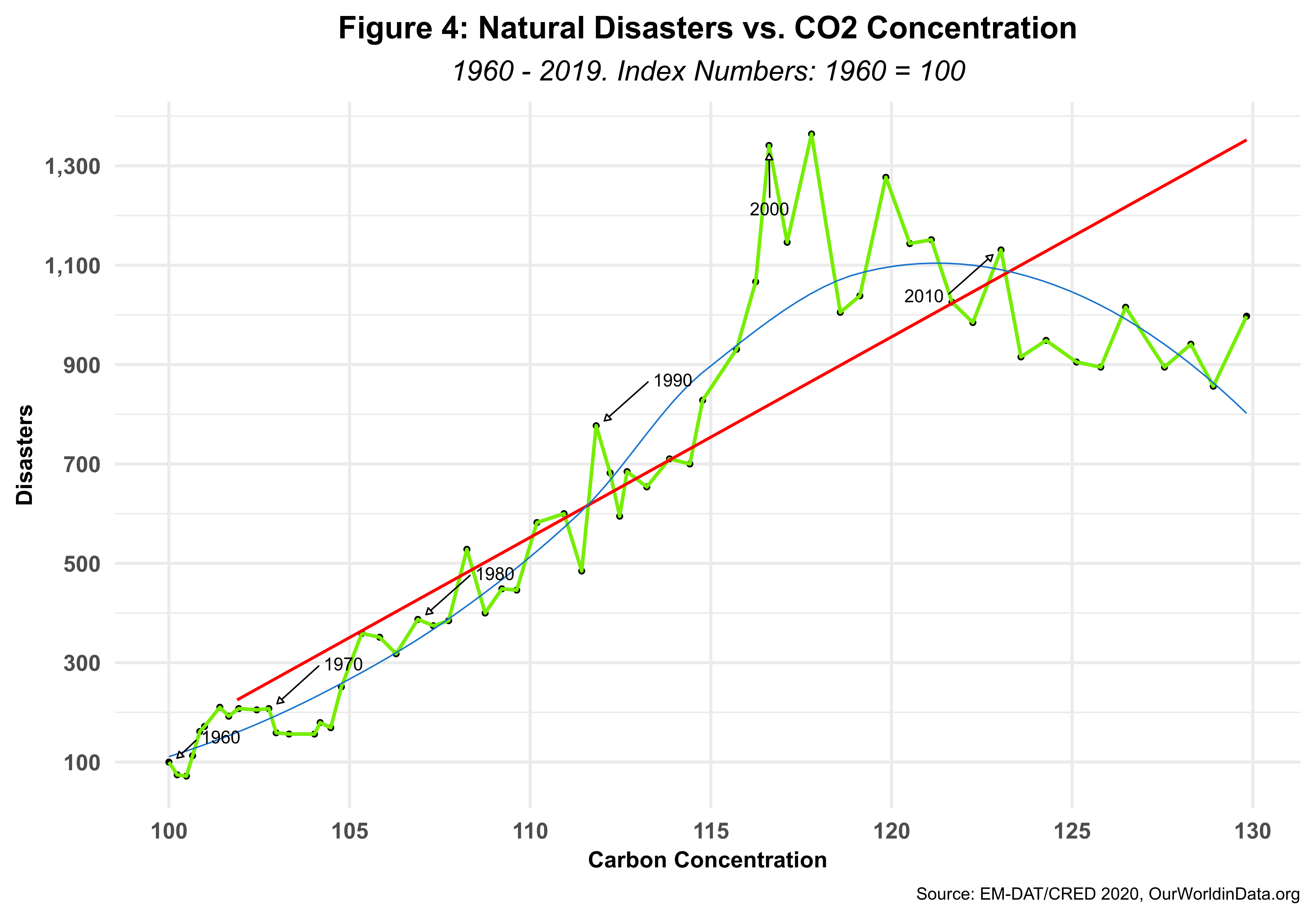 Figure 4 further explores the relationship between increased natural disasters and caron concentration from 1960 until the end of 2019.