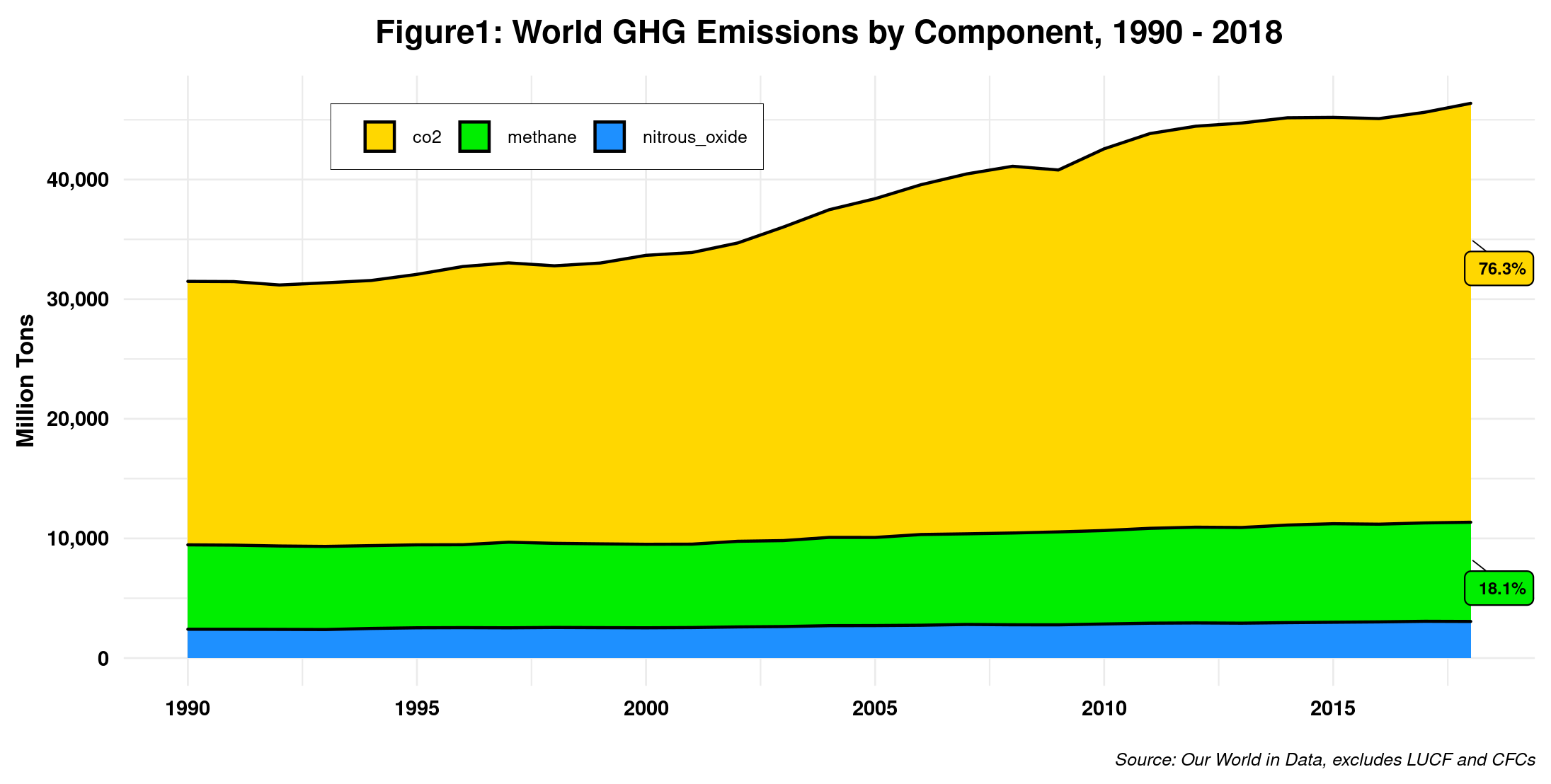 Figure 1 shows global GHG by components, excluding land use change and forest (LUCF) and the awful stuff mentioned at the beginning. Not including the former is problematic, especially for countries and regions where such emissions (that comprise CO2, CH4 and N2O) are relatively large. On the other hand, note that methane and nitrous oxide data include some LUCF emissions. No one said this was going to be easy!