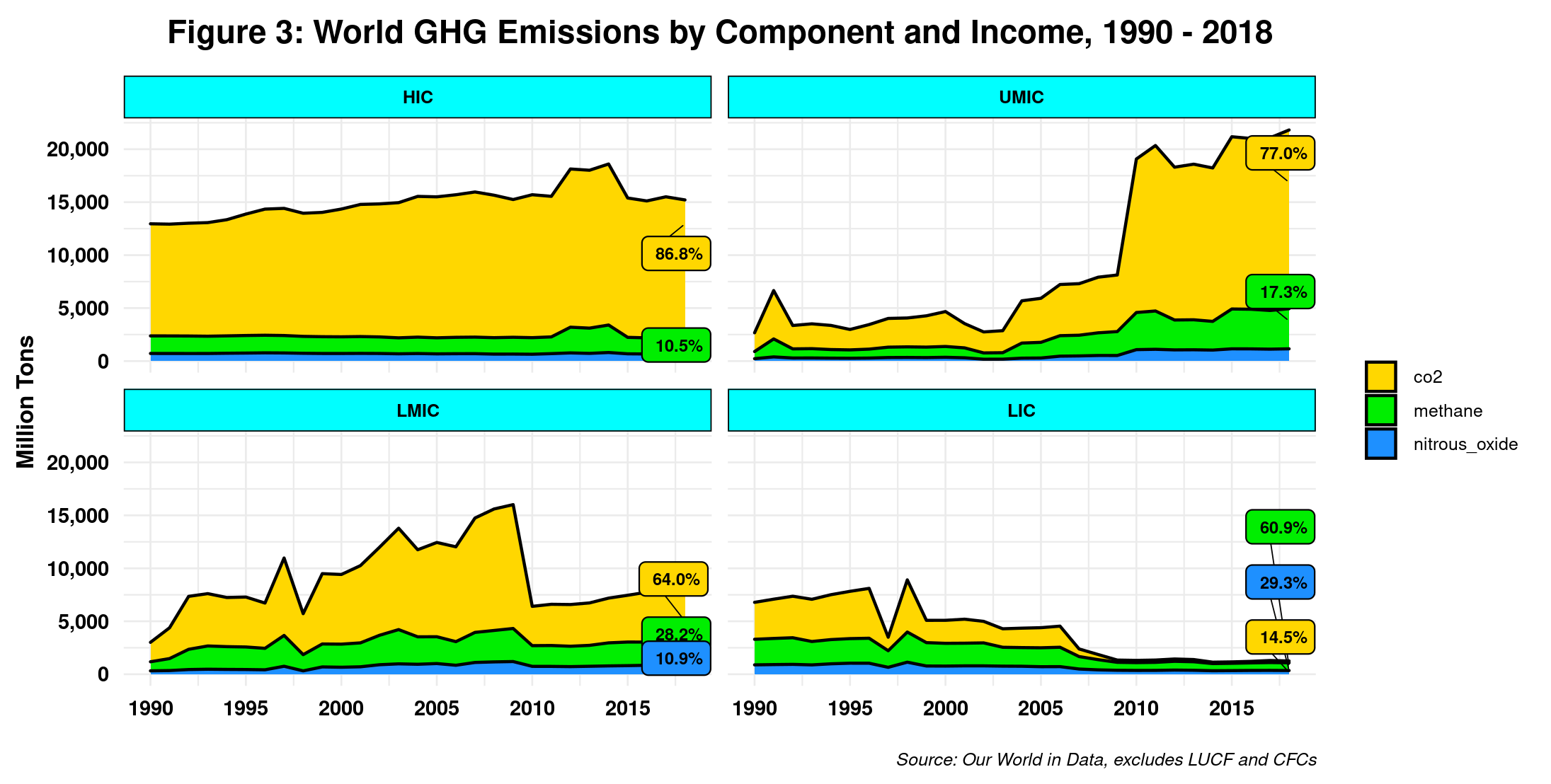 The sudden ups and downs in the curves of some of the quadrants reflect the fact that both India and China started as low-income countries (LIC) in 1990 but are now part of the low-middle income (LMIC) and upper-middle-income (UMIC) cohorts, respectively. While here we also have the same LUCF bias, we find at the same time similar patterns, such as methane being the top GHG in low-income countries (LIC). Nevertheless, LIC methane emissions only account for 9 percent of the world’s total. Note also that CO2 and methane emissions in such a group of countries have declined substantially since 1998 (again, discounting LUCF) after India moved into the LMIC floor the previous year. Regardless, there is an inverse correlation between income levels and methane emissions. The higher the former, the lower the latter. Still, in 2018, six countries (China, Russia, India, USA, Brazil and Indonesia) accounted for almost 50 percent of all methane emissions. No LICs on this list, with India and Indonesia being the only LMICs.
