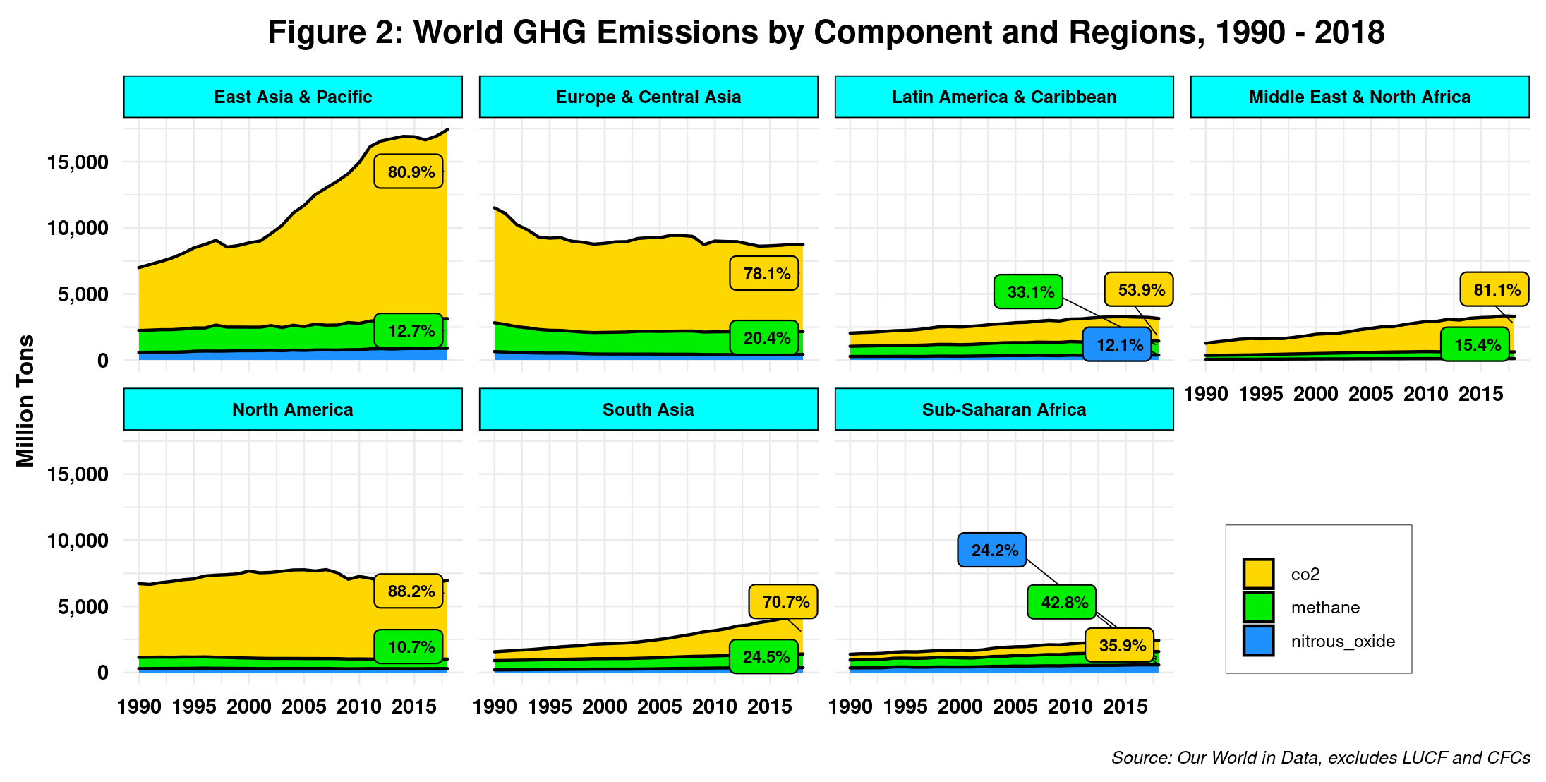 At any rate, we can clearly see that in 2018 CO2 was by far the largest source of emissions. Moreover, we can intuitively see that CO2 emissions have grown much faster than the other two GHG since the 1990s (GHG data for previous years does not seem to exist, unfortunately). Therefore, if it was up to me, I would direct all my energies to tackle the Co2 threat, more so if we factor in its GWP. Figure 2 shows the same deal but adds regions.
