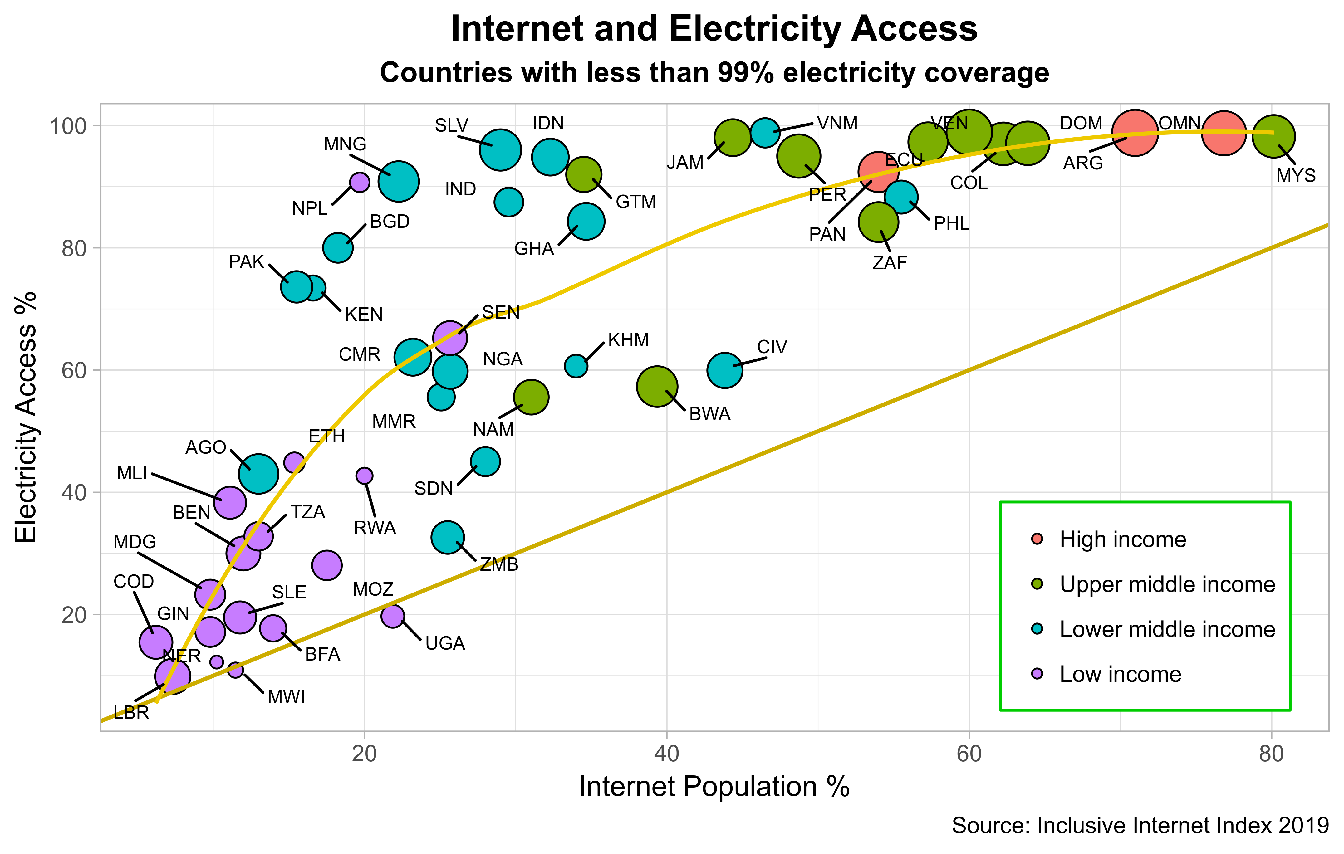 Looking more closely at both the data and the graph, we can identify four clusters of countries. The light yellow curve showing the non-linear trend of the country data provides an initial hint. In the upper right corner, we have countries with both a relatively high number of Internet users and grid access no less than 90%. This group includes the only high-income countries captured by the sample for this analysis. The second cluster is in the upper left corner where countries with high grid access have relatively small numbers of Internet users. This set of states are the worst performers as the gap between Internet and grid access is the largest of all clusters. We can easily measure this by seeing the distance between each county bubble and the ideal state 45-degree line. None of these countries reach the 40% Internet population mark. Nepal, the only low-income country in this cluster, leads here but not by much.